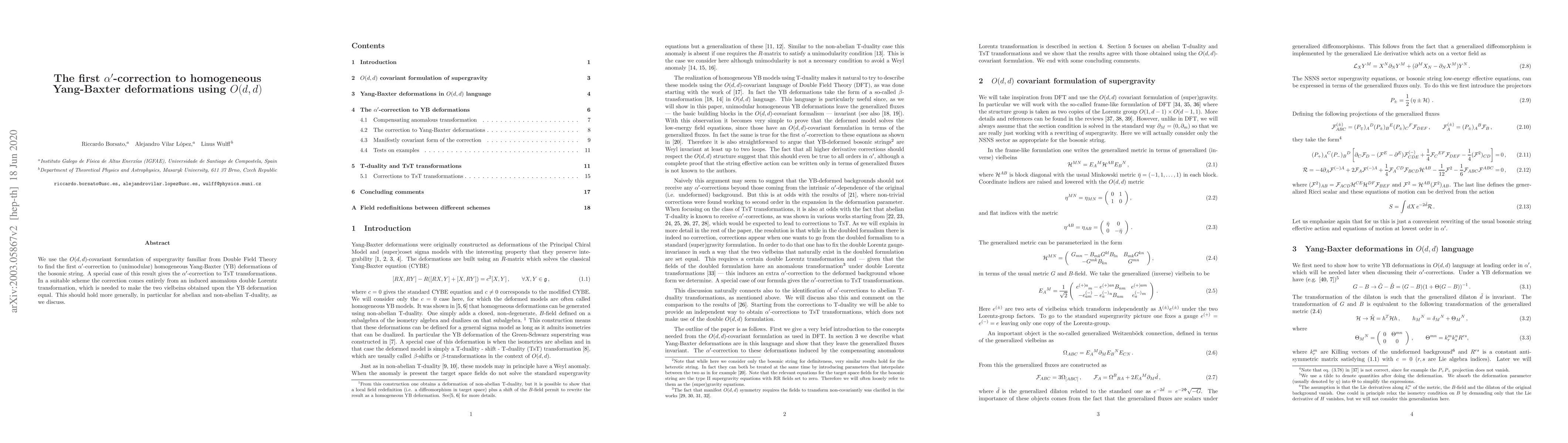 We use the $O(d,d)$-covariant formulation of supergravity familiar from Double Field Theory to find the first $\alpha'$-correction to (unimodular) homogeneous Yang-Baxter (YB) deformations of the bosonic string. A special case of this result gives the $\alpha'$-correction to TsT transformations. In a suitable scheme the correction comes entirely from an induced anomalous double Lorentz transformation, which is needed to make the two vielbeins obtained upon the YB deformation equal. This should hold more generally, in particular for abelian and non-abelian T-duality, as we discuss.