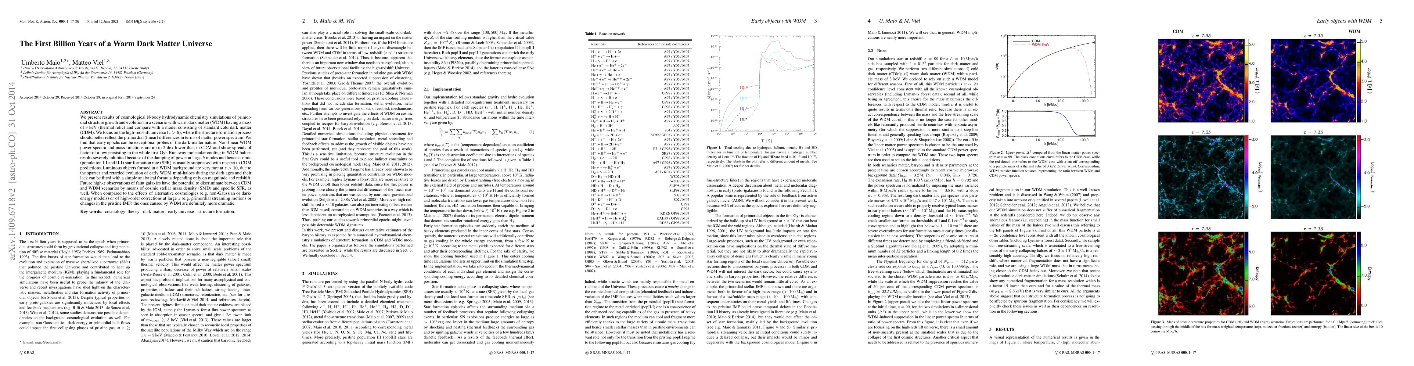 We present results of cosmological N-body hydrodynamic chemistry simulations of primordial structure growth and evolution in a scenario with warm dark matter (WDM) having a mass of 3 keV (thermal relic) and compare with a model consisting of standard cold dark matter (CDM). We focus on the high-redshift universe ($z>6$), where the structure formation process should better reflect the primordial (linear) differences in terms of matter power spectrum. We find that early epochs can be exceptional probes of the dark-matter nature. Non-linear WDM power spectra and mass functions are up to 2 dex lower than in CDM and show spreads of factor of a few persisting in the whole first Gyr. Runaway molecular cooling in WDM haloes results severely inhibited because of the damping of power at large $k$ modes and hence cosmic (population III and II-I) star formation rate (SFR) is usually suppressed with respect to CDM predictions. Luminous objects formed in a WDM background are very rare at $z>10$, due to the sparser and retarded evolution of early WDM mini-haloes during the dark ages and their lack can be fitted with a simple analytical formula depending only on magnitude and redshift. Future high-$z$ observations of faint galaxies have the potential to discriminate between CDM and WDM scenarios by means of cosmic stellar mass density (SMD) and specific SFR, as well. When compared to the effects of alternative cosmologies (e.g. non-Gaussian or dark-energy models) or of high-order corrections at large $z$ (e.g. primordial streaming motions or changes in the pristine IMF) the ones caused by WDM are definitely more dramatic.