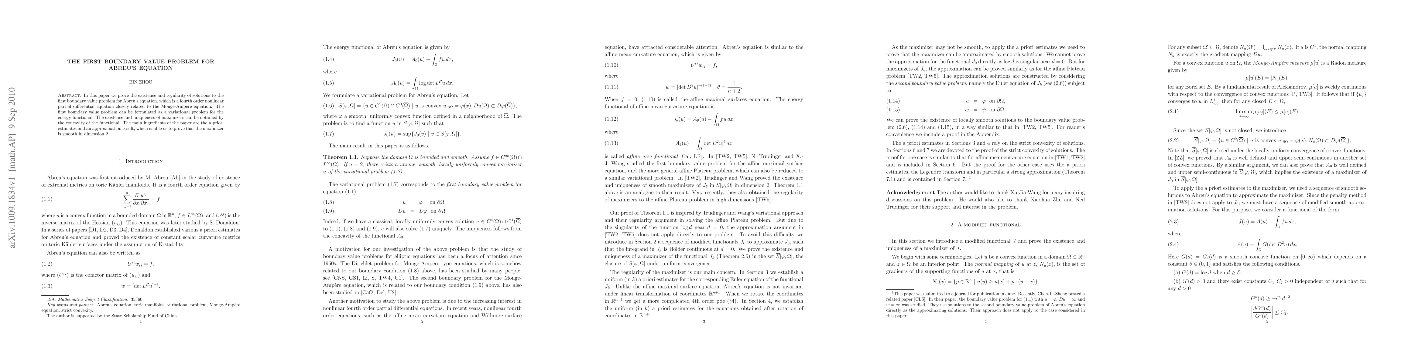 This paper proves the existence and regularity of solutions to the first boundary value problem for Abreu's equation, a fourth-order nonlinear PDE. The problem is formulated as a variational problem, and the concavity of the associated energy functional ensures the existence and uniqueness of smooth maximizers in dimension 2.