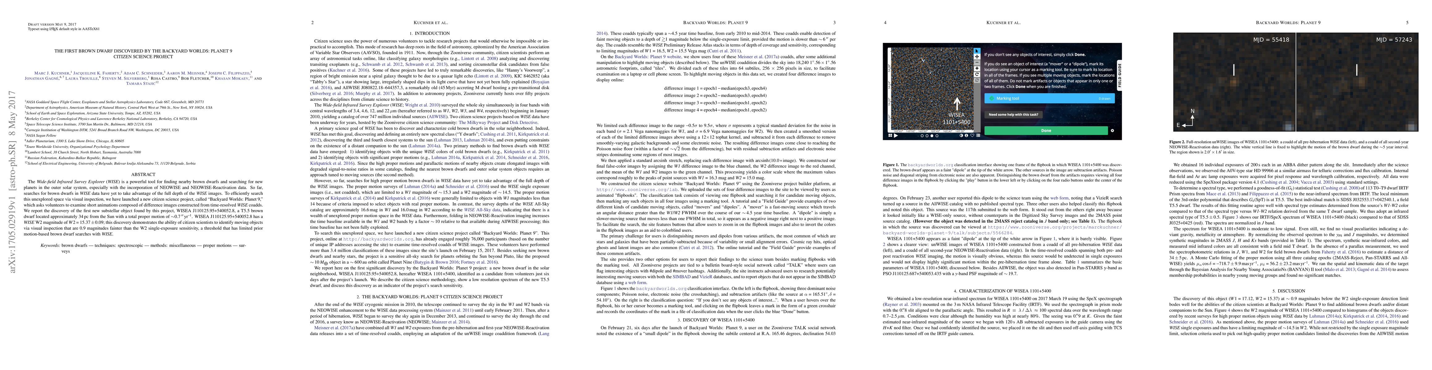 The Backyard Worlds: Planet 9 citizen science project discovered the first brown dwarf using visual inspection of WISE data animations, identifying a T5.5 brown dwarf approximately 34 pc from the Sun, demonstrating citizen scientists' capability to find objects fainter than previous search limits.