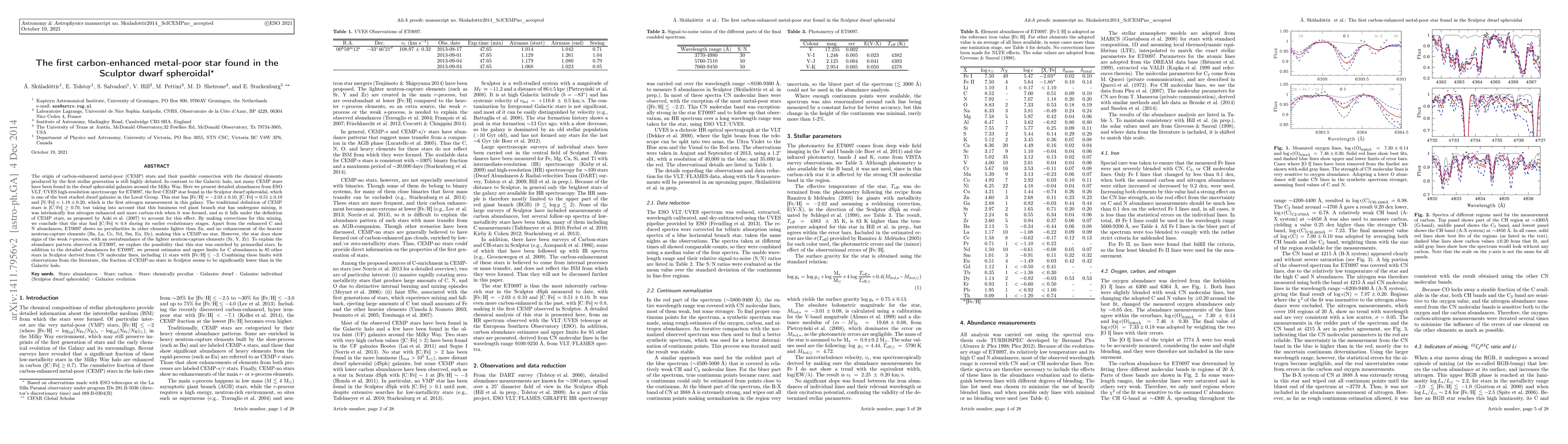 This paper identifies ET0097 as the first carbon-enhanced metal-poor (CEMP) star in the Sculptor dwarf galaxy, revealing its unique chemical composition and suggesting it was enriched by primordial stars. The star shows enhanced carbon and nitrogen, typical of CEMP stars, but lacks enhancements in heavier neutron-capture elements, classifying it as a CEMP-no star.