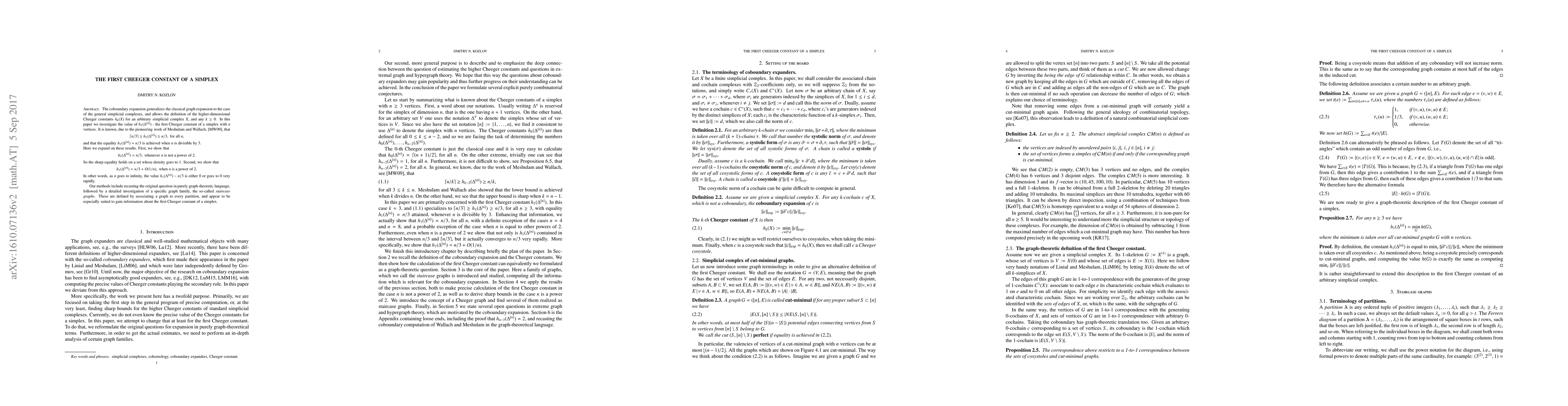 The coboundary expansion generalizes the classical graph expansion to the case of the general simplicial complexes, and allows the definition of the higher-dimensional Cheeger constants $h_k(X)$ for an arbitrary simplicial complex $X$, and any $k\geq 0$. In this paper we investigate the value of $h_1(\Delta^{[n]})$ - the first Cheeger constant of a simplex with $n$ vertices. It is known, due to the pioneering work of Meshulam and Wallach, that \[\lceil n/3\rceil\geq h_1(\Delta^{[n]})\geq n/3, \textrm{ for all } n,\] and that the equality $h_1(\Delta^{[n]})=n/3$ is achieved when $n$ is divisible by $3$. Here we expand on these results. First, we show that \[h_1(\Delta^{[n]})=n/3, \textrm{ whenever }n\textrm{ is not a power of }2.\] So the sharp equality holds on a set whose density goes to $1$. Second, we show that \[h_1(\Delta^{[n]})=n/3+O(1/n),\textrm{ when }n\textrm{ is a power of }2.\] In other words, as $n$ goes to infinity, the value $h_1(\Delta^{[n]})-n/3$ is either $0$ or goes to $0$ very rapidly. Our methods include recasting the original question in purely graph-theoretic language, followed by a detailed investigation of a specific graph family, the so-called {\it staircase graphs}. These are defined by associating a graph to every partition, and appear to be especially suited to gain information about the first Cheeger constant of a simplex.