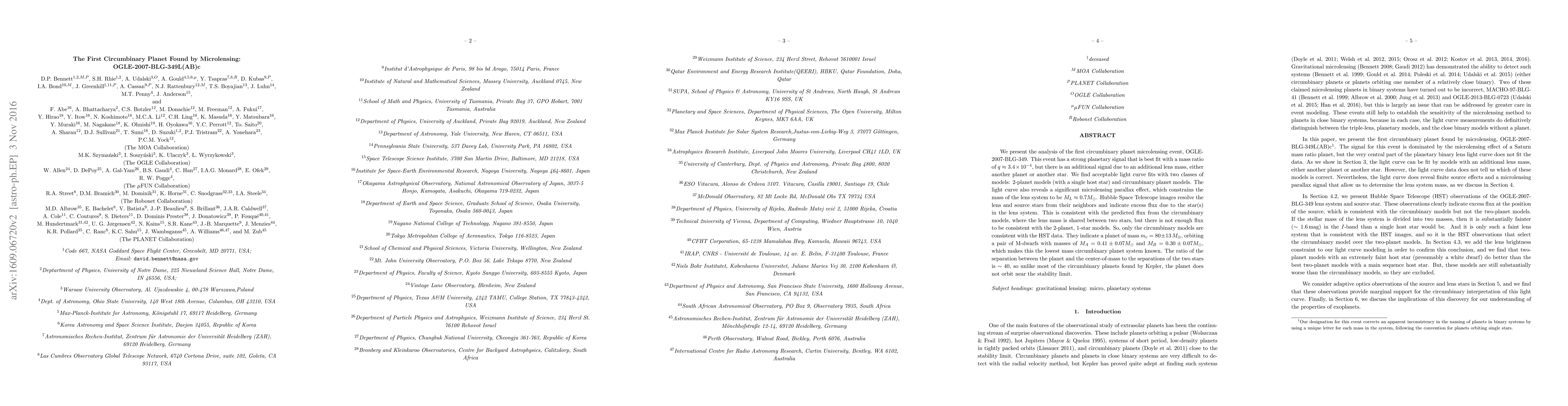 We present the analysis of the first circumbinary planet microlensing event, OGLE-2007-BLG-349. This event has a strong planetary signal that is best fit with a mass ratio of $q \approx 3.4\times10^{-4}$, but there is an additional signal due to an additional lens mass, either another planet or another star. We find acceptable light curve fits with two classes of models: 2-planet models (with a single host star) and circumbinary planet models. The light curve also reveals a significant microlensing parallax effect, which constrains the mass of the lens system to be $M_L \approx 0.7 M_\odot$. Hubble Space Telescope images resolve the lens and source stars from their neighbors and indicate excess flux due to the star(s) in the lens system. This is consistent with the predicted flux from the circumbinary models, where the lens mass is shared between two stars, but there is not enough flux to be consistent with the 2-planet, 1-star models. So, only the circumbinary models are consistent with the HST data. They indicate a planet of mass $m_c = 80\pm 13\,M_\oplus$, orbiting a pair of M-dwarfs with masses of $M_A = 0.41\pm 0.07 M_\odot$ and $M_B = 0.30\pm 0.07 M_\oplus$, which makes this the lowest mass circumbinary planet system known. The ratio of the separation between the planet and the center-of-mass to the separations of the two stars is $\sim 40$, so unlike most of the circumbinary planets found by Kepler, the planet does not orbit near the stability limit.