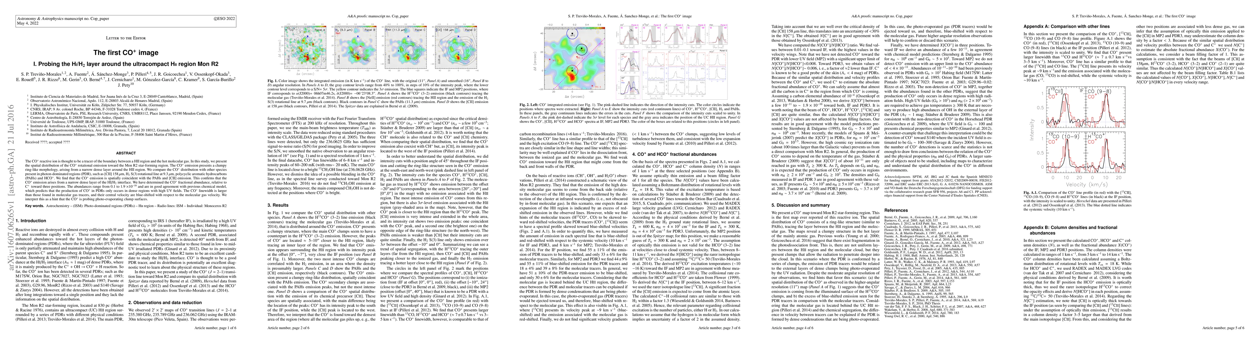 The CO+ reactive ion is thought to be a tracer of the boundary between a HII region and the hot molecular gas. In this study, we present the spatial distribution of the CO+ rotational emission toward the Mon R2 star-forming region. The CO+ emission presents a clumpy ring-like morphology, arising from a narrow dense layer around the HII region. We compare the CO+ distribution with other species present in photon-dominated regions (PDR), such as [CII] 158 mm, H2 S(3) rotational line at 9.3 mm, polycyclic aromatic hydrocarbons (PAHs) and HCO+. We find that the CO+ emission is spatially coincident with the PAHs and [CII] emission. This confirms that the CO+ emission arises from a narrow dense layer of the HI/H2 interface. We have determined the CO+ fractional abundance, relative to C+ toward three positions. The abundances range from 0.1 to 1.9x10^(-10) and are in good agreement with previous chemical model, which predicts that the production of CO+ in PDRs only occurs in dense regions with high UV fields. The CO+ linewidth is larger than those found in molecular gas tracers, and their central velocity are blue-shifted with respect to the molecular gas velocity. We interpret this as a hint that the CO+ is probing photo-evaporating clump surfaces.