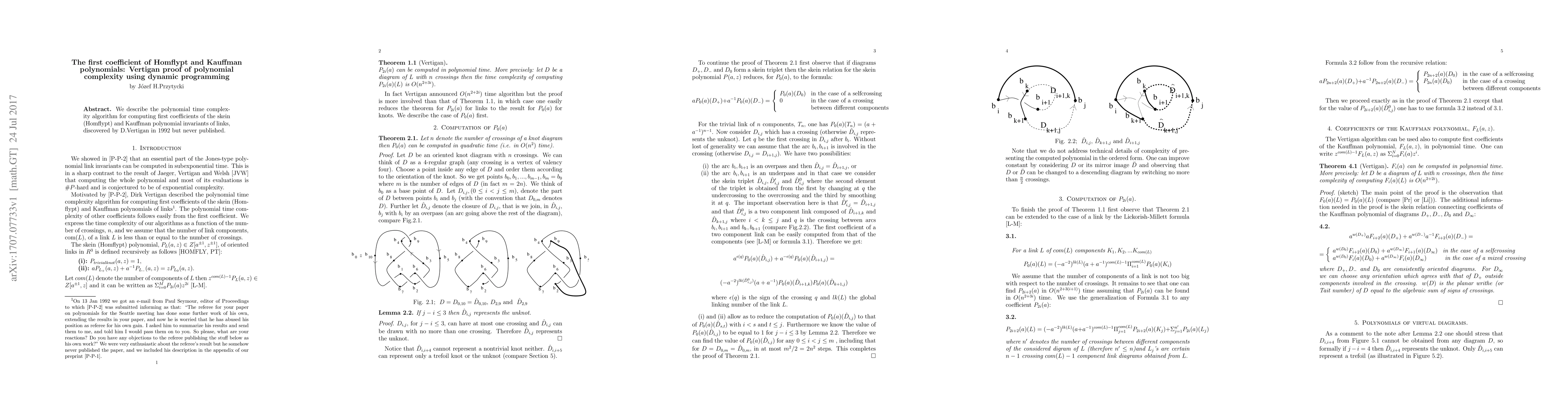 We describe the polynomial time complexity algorithm for computing first coefficients of the skein (Homflypt) and Kauffman polynomial invariants of links, discovered by D.Vertigan in 1992 but never published.
