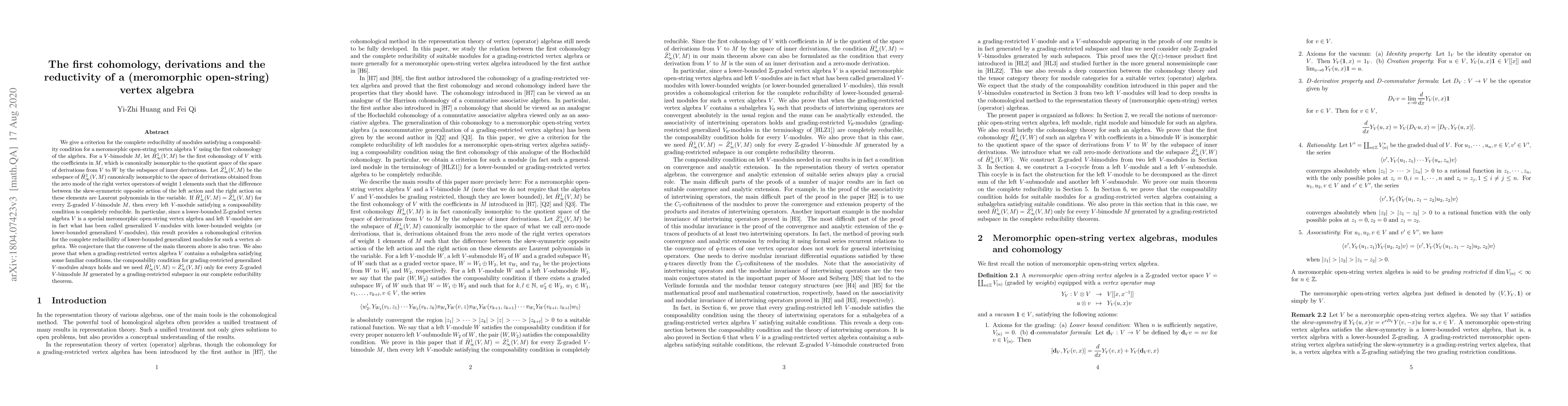 We give a criterion for the complete reducibility of modules satisfying a composability condition for a meromorphic open-string vertex algebra $V$ using the first cohomology of the algebra. For a $V$-bimodule $M$, let $\hat{H}^{1}_{\infty}(V, M)$ be the first cohomology of $V$ with the coefficients in $M$. Let $\hat{Z}^{1}_{\infty}(V, M)$ be the subspace of $\hat{H}^{1}_{\infty}(V, M)$ canonically isomorphic to the space of derivations obtained from the zero mode of the right vertex operators of weight $1$ elements such that the difference between the skew-symmetric opposite action of the left action and the right action on these elements are Laurent polynomials in the variable. If $\hat{H}^{1}_{\infty}(V, M)= \hat{Z}^{1}_{\infty}(V, M)$ for every $\Z$-graded $V$-bimodule $M$, then every left $V$-module satisfying a composability condition is completely reducible. In particular, since a lower-bounded $\Z$-graded vertex algebra $V$ is a special meromorphic open-string vertex algebra and left $V$-modules are in fact what has been called generalized $V$-modules with lower-bounded weights (or lower-bounded generalized $V$-modules), this result provides a cohomological criterion for the complete reducibility of lower-bounded generalized modules for such a vertex algebra. We conjecture that the converse of the main theorem above is also true. We also prove that when a grading-restricted vertex algebra $V$ contains a subalgebra satisfying some familiar conditions, the composability condition for grading-restricted generalized $V$-modules always holds and we need $\hat{H}^{1}_{\infty}(V, M)= \hat{Z}^{1}_{\infty}(V, M)$ only for every $\Z$-graded $V$-bimodule $M$ generated by a grading-restricted subspace in our complete reducibility theorem.