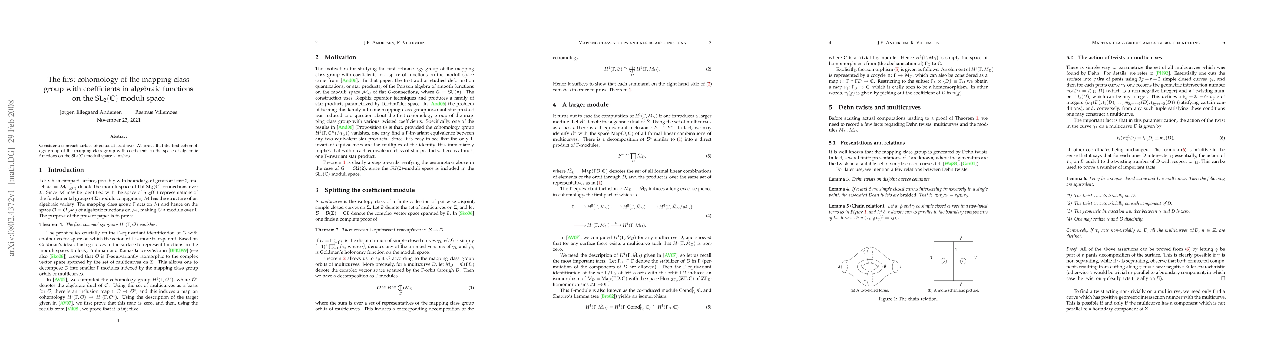 Consider a compact surface of genus at least two. We prove that the first cohomology group of the mapping class group with coefficients in the space of algebraic functions on the SL(2, C) moduli space vanishes.