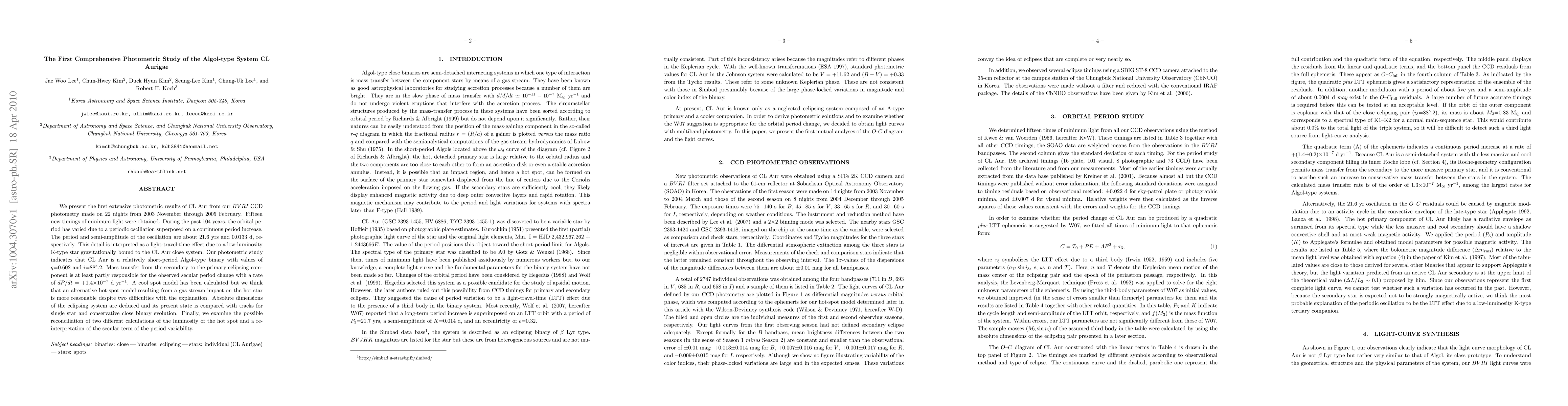 We present the first extensive photometric results of CL Aur from our BVRI CCD photometry made on 22 nights from 2003 November through 2005 February. Fifteen new timings of minimum light were obtained. During the past 104 years, the orbital period has varied due to a periodic oscillation superposed on a continuous period increase. The period and semi-amplitude of the oscillation are about 21.6 yrs and 0.0133 d, respectively. This detail is interpreted as a light-travel-time effect due to a low-luminosity K-type star gravitationally bound to the CL Aur close system. Our photometric study indicates that CL Aur is a relatively short-period Algol-type binary with values of q=0.602 and i=88$^\circ$.2. Mass transfer from the secondary to the primary eclipsing component is at least partly responsible for the observed secular period change with a rate of dP/dt = +1.4$\times10^{-7}$ d yr$^{-1}$. A cool spot model has been calculated but we think that an alternative hot-spot model resulting from a gas stream impact on the hot star is more reasonable despite two difficulties with the explanation. Absolute dimensions of the eclipsing system are deduced and its present state is compared with tracks for single star and conservative close binary evolution. Finally, we examine the possible reconciliation of two different calculations of the luminosity of the hot spot and a re-interpretation of the secular term of the period variability.