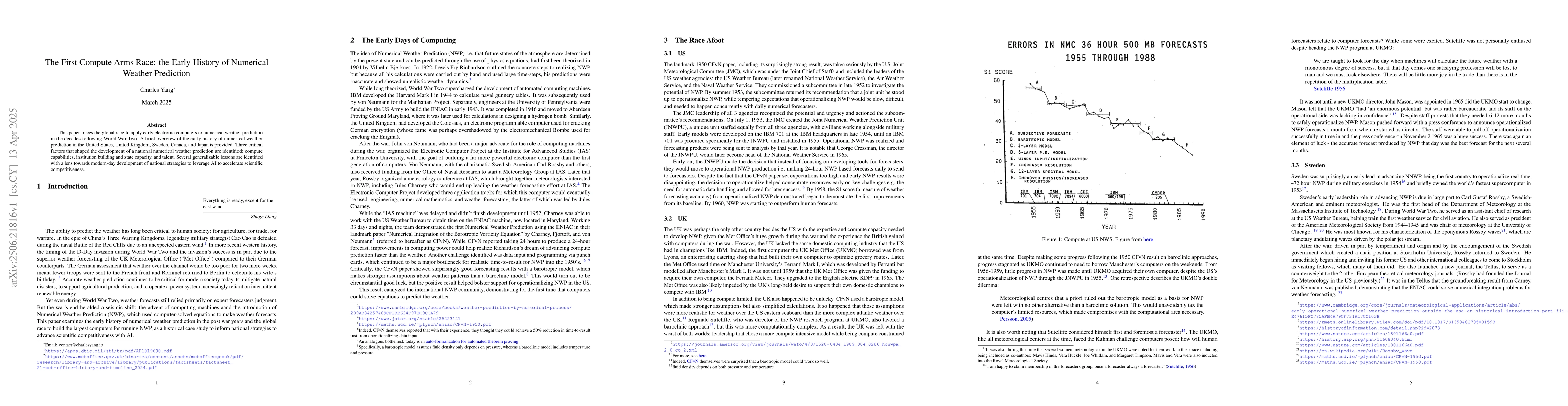 This paper traces the global race to apply early electronic computers to numerical weather prediction in the decades following World War Two. A brief overview of the early history of numerical weather prediction in the United States, United Kingdom, Sweden, Canada, and Japan is provided. Three critical factors that shaped the development of a national numerical weather prediction are identified: compute capabilities, institution building and state capacity, and talent. Several generalizable lessons are identified with a lens towards modern-day development of national strategies to leverage AI to accelerate scientific competitiveness.