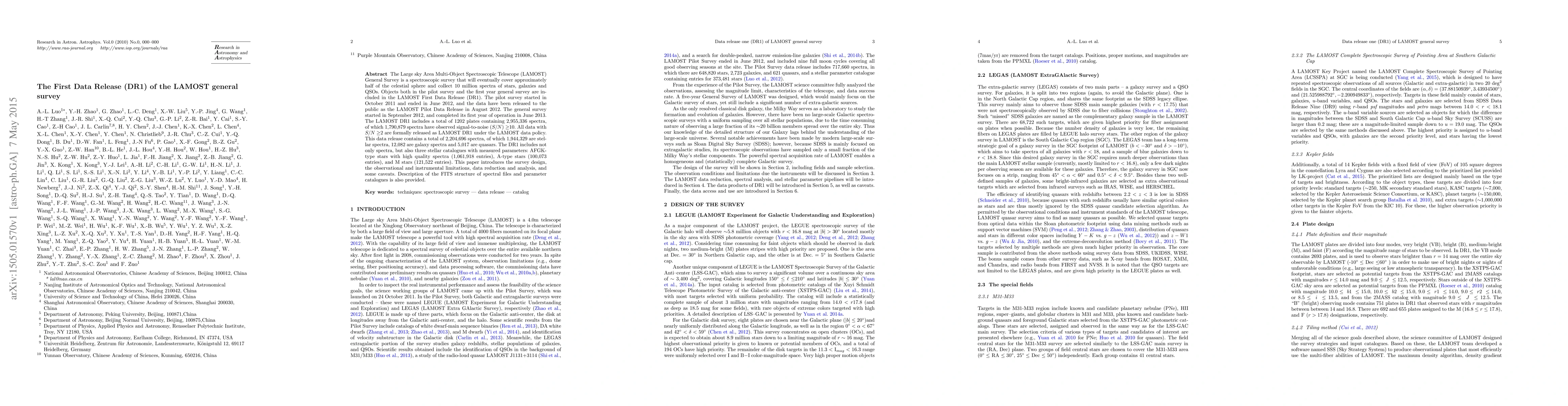 The LAMOST First Data Release (DR1) includes 2,955,336 spectra from both pilot and general surveys, with 1,790,879 spectra having a signal-to-noise ratio greater than 10. This release comprises 2,204,696 spectra, including stellar, galaxy, and quasar spectra, along with three stellar catalogues.