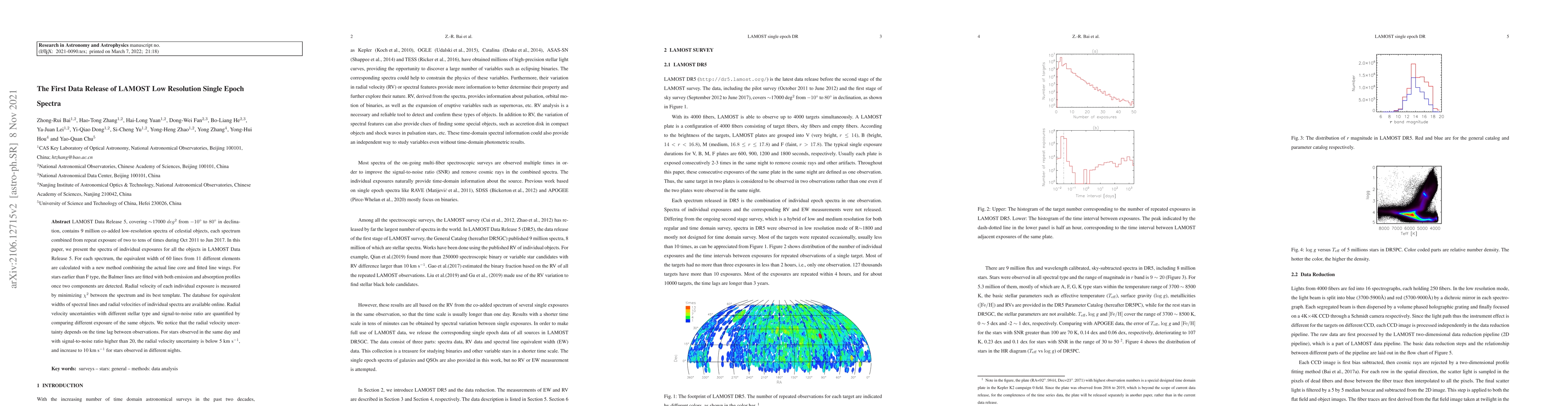 LAMOST Data Release 5, covering $\sim$17,000 $deg^2$ from $-10^{\circ}$ to $80^{\circ}$ in declination, contains 9 millions co-added low resolution spectra of celestial objects, each spectrum combined from repeat exposure of two to tens of times during Oct 2011 to Jun 2017. In this paper, We present the spectra of individual exposures for all the objects in LAMOST Data Release 5. For each spectrum, equivalent width of 60 lines from 11 different elements are calculated with a new method combining the actual line core and fitted line wings. For stars earlier than F type, the Balmer lines are fitted with both emission and absorption profiles once two components are detected. Radial velocity of each individual exposure is measured by minimizing ${\chi}^2$ between the spectrum and its best template. Database for equivalent widths of spectral lines and radial velocities of individual spectra are available online. Radial velocity uncertainties with different stellar type and signal-to-noise ratio are quantified by comparing different exposure of the same objects. We notice that the radial velocity uncertainty depends on the time lag between observations. For stars observed in the same day and with signal-to-noise ratio higher than 20, the radial velocity uncertainty is below 5km/s, and increase to 10km/s for stars observed in different nights.