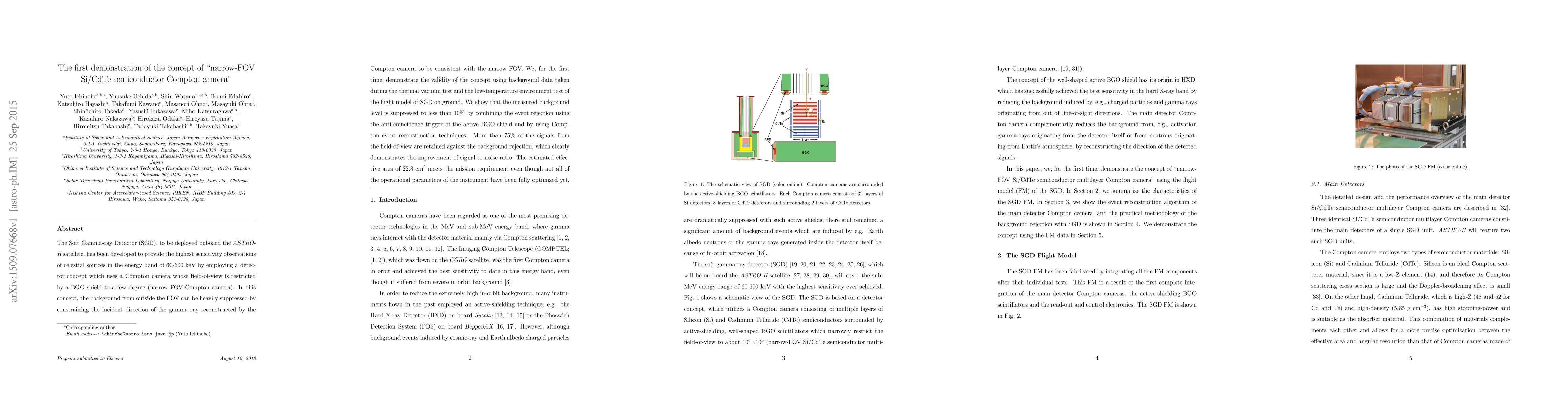 This paper demonstrates the first successful implementation of a narrow-FOV Si/CdTe semiconductor Compton camera for the Soft Gamma-ray Detector (SGD) onboard the ASTRO-H satellite, achieving a significant reduction in background noise and maintaining over 75% signal retention. The effective area of 22.8 cm² meets mission requirements despite incomplete optimization.