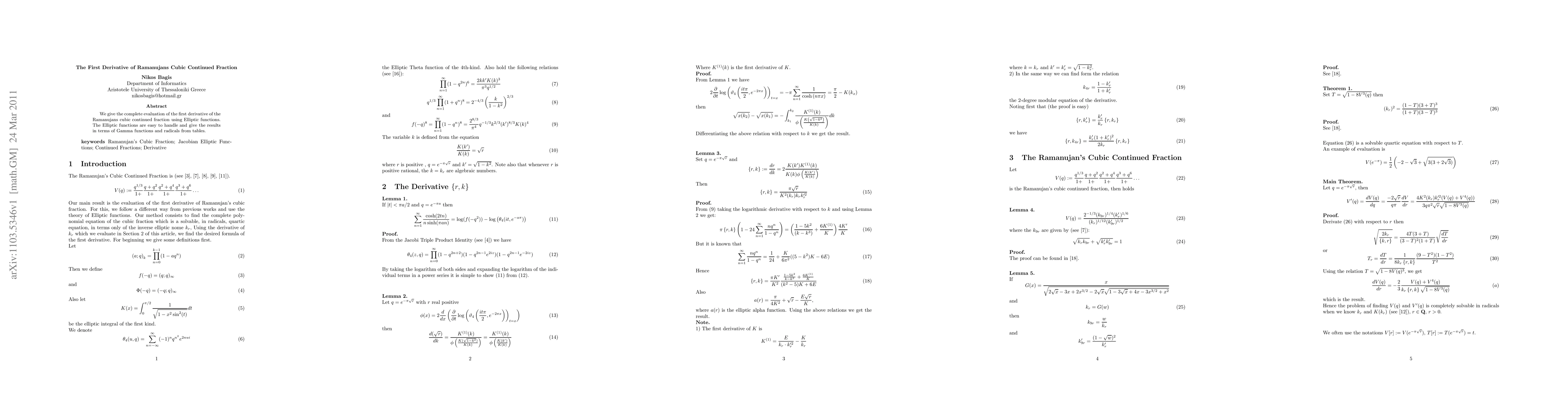 Summary: This paper evaluates the first derivative of Ramanujans cubic continued fraction, employing Elliptic functions to derive results expressed in terms of Gamma functions and radicals, facilitating straightforward computation.