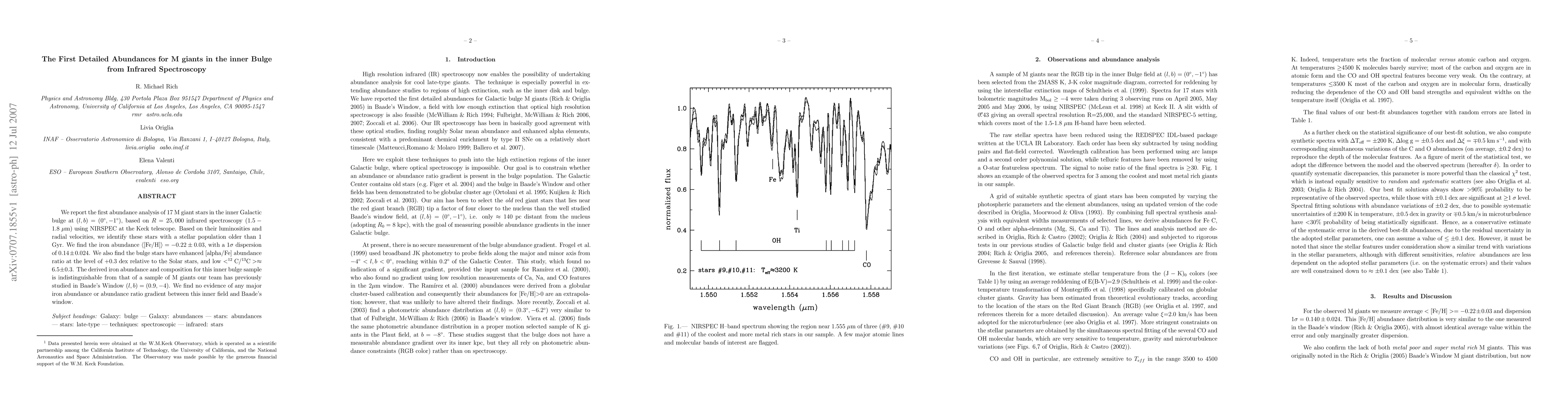 This study presents the first detailed abundance analysis of 17 M giant stars in the inner Galactic bulge using high-resolution infrared spectroscopy, revealing an iron abundance of $\rm < [Fe/H] > = -0.22 \pm 0.03$ and an enhanced [$\rm alpha$/Fe] ratio of +0.3 dex.