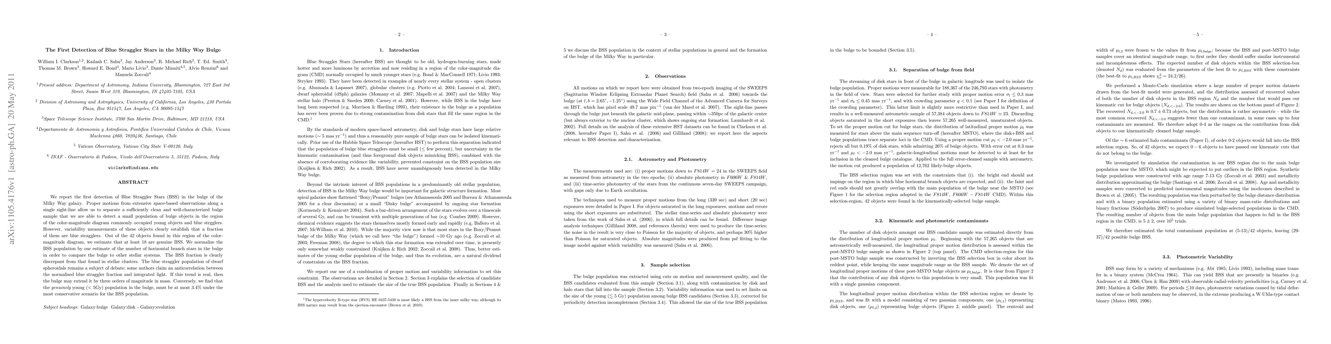 This paper reports the first detection of Blue Straggler Stars (BSS) in the Milky Way bulge, revealing at least 18 genuine BSS out of 42 objects. The findings suggest a significantly lower fraction of young stars in the bulge compared to stellar clusters, potentially extending the trend of BSS population in dwarf spheroidals by three orders of magnitude in mass.