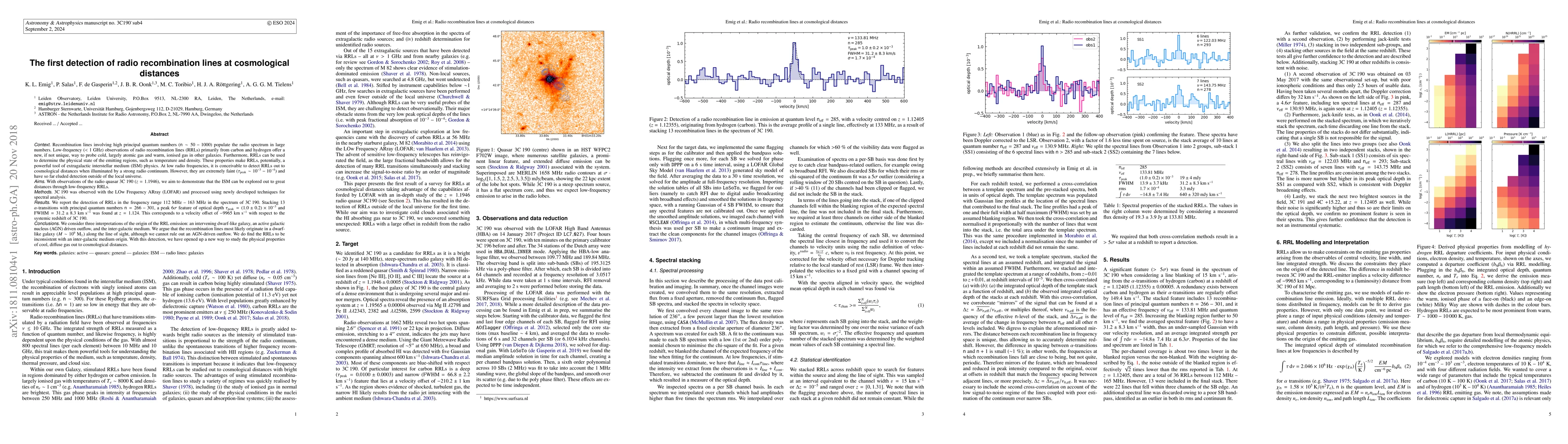 This paper reports the first detection of radio recombination lines (RRLs) at cosmological distances using LOFAR observations of the radio quasar 3C 190. The detected RRLs suggest the presence of cool, diffuse gas in a dwarf-like galaxy along the line of sight, opening a new method to study extragalactic interstellar medium physics.