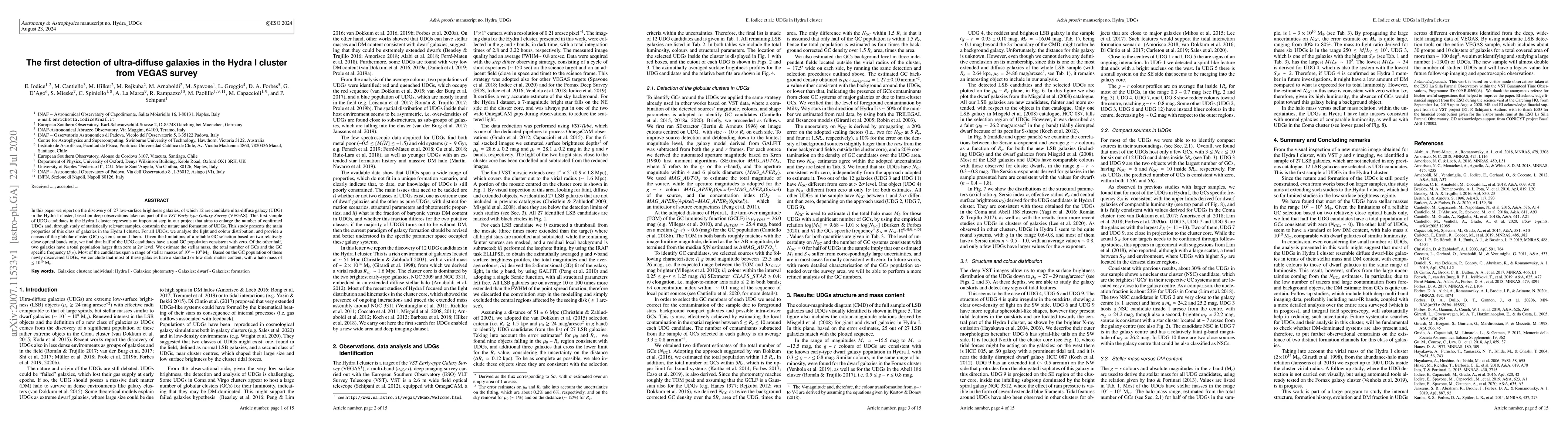 This paper reports the first detection of 12 candidate ultra-diffuse galaxies (UDGs) in the Hydra I cluster using the VEGAS survey, finding them to have low-surface brightness and a range of stellar masses between $10^7-10^8$~M$_{\odot}$. Most exhibit a negligible globular cluster population, suggesting low dark matter content and halo masses of $\leq 10^{10}$~M$_{\odot}$.