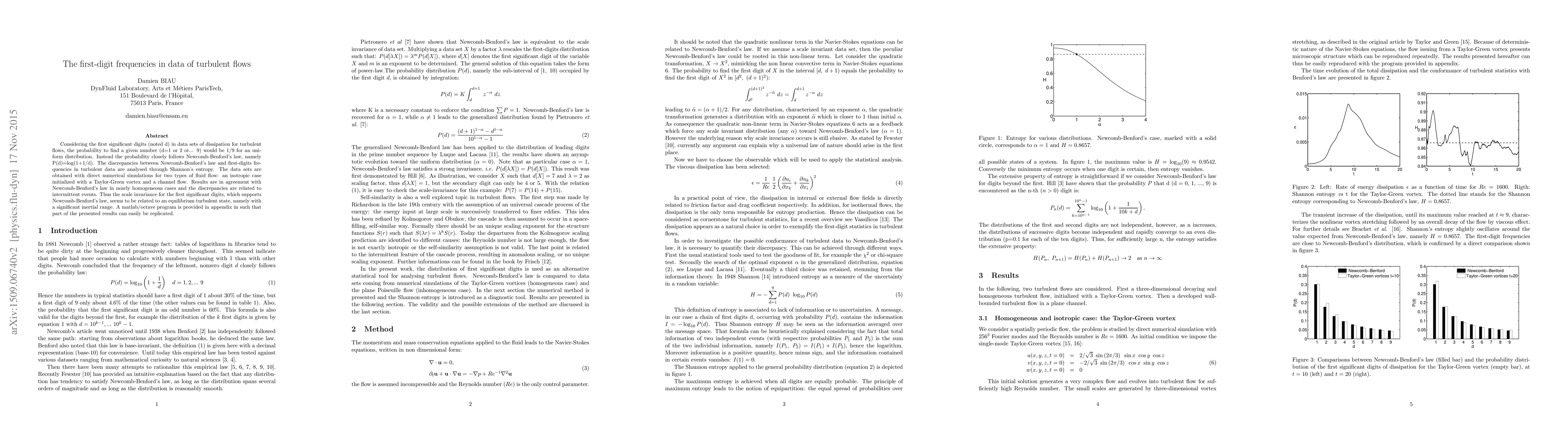 Considering the first significant digits (noted d) in data sets of dissipation for turbulent flows, the probability to find a given number (d=1 or 2 or... 9) would be 1/9 for an uniform distribution. Instead the probability closely follows Newcomb-Benford's law, namely P(d)=log(1+1/d). The discrepancies between Newcomb-Benford's law and first-digits frequencies in turbulent data are analysed through Shannon's entropy. The data sets are obtained with direct numerical simulations for two types of fluid flow: an isotropic case initialized with a Taylor-Green vortex and a channel flow. Results are in agreement with Newcomb-Benford's law in nearly homogeneous cases and the discrepancies are related to intermittent events. Thus the scale invariance for the first significant digits, which supports Newcomb-Benford's law, seems to be related to an equilibrium turbulent state, namely with a significant inertial range. A matlab/octave program is provided in appendix in such that part of the presented results can easily be replicated.