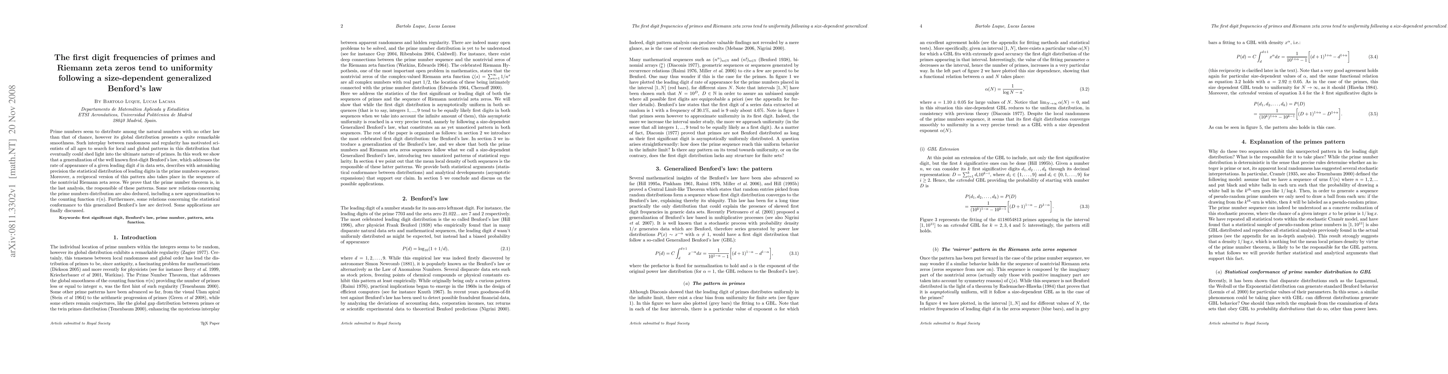 Prime numbers seem to distribute among the natural numbers with no other law than that of chance, however its global distribution presents a quite remarkable smoothness. Such interplay between randomness and regularity has motivated sci- entists of all ages to search for local and global patterns in this distribution that eventually could shed light into the ultimate nature of primes. In this work we show that a generalization of the well known first-digit Benford's law, which addresses the rate of appearance of a given leading digit d in data sets, describes with astonishing precision the statistical distribution of leading digits in the prime numbers sequence. Moreover, a reciprocal version of this pattern also takes place in the sequence of the nontrivial Riemann zeta zeros. We prove that the prime number theorem is, in the last analysis, the responsible of these patterns. Some new relations concerning the prime numbers distribution are also deduced, including a new approximation to the counting function pi(n). Furthermore, some relations concerning the statistical conformance to this generalized Benford's law are derived. Some applications are finally discussed.