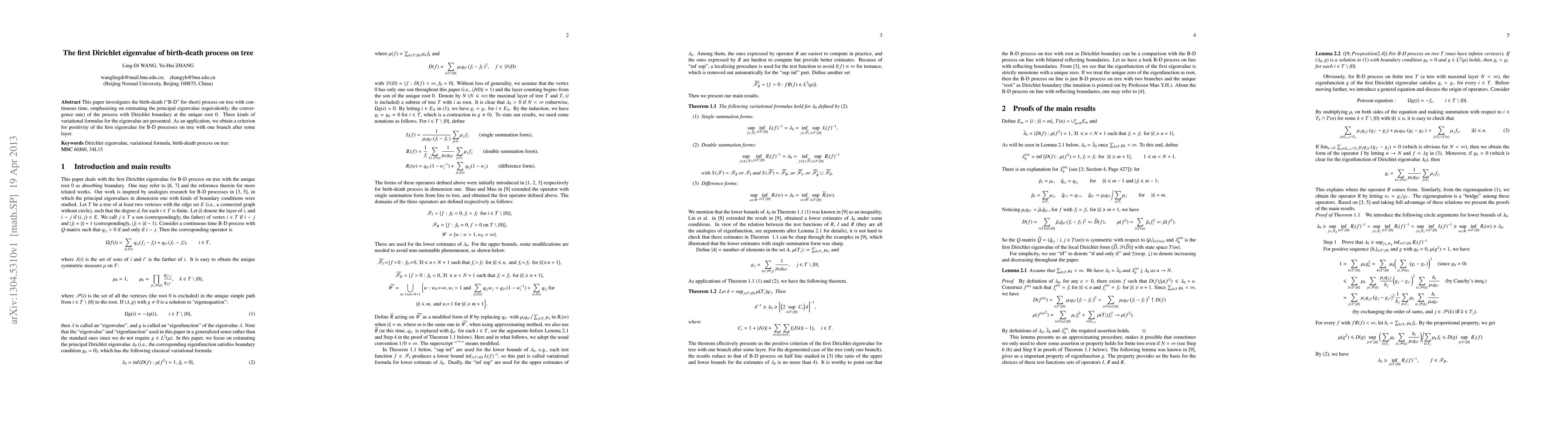 This paper explores the birth-death process on a tree, focusing on estimating the principal eigenvalue, which determines the convergence rate, using Dirichlet boundary conditions at the root. It presents three variational formulas for the eigenvalue and applies them to establish criteria for the positivity of the first eigenvalue in specific tree structures.