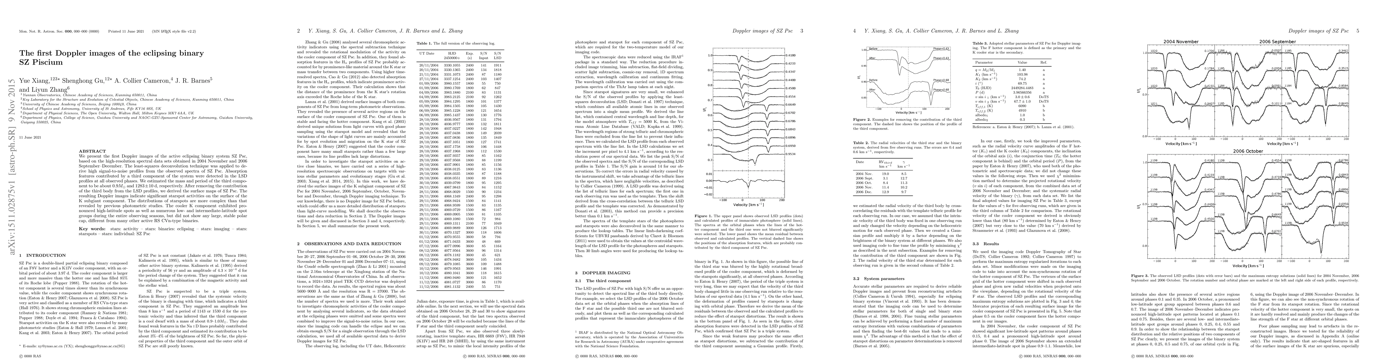 We present the first Doppler images of the active eclipsing binary system SZ Psc, based on the high-resolution spectral data sets obtained in 2004 November and 2006 September--December. The least-squares deconvolution technique was applied to derive high signal-to-noise profiles from the observed spectra of SZ Psc. Absorption features contributed by a third component of the system were detected in the LSD profiles at all observed phases. We estimated the mass and period of the third component to be about $0.9 M_{\odot}$ and $1283 \pm 10$ d, respectively. After removing the contribution of the third body from the LSD profiles, we derived the surface maps of SZ Psc. The resulting Doppler images indicate significant starspot activities on the surface of the K subgiant component. The distributions of starspots are more complex than that revealed by previous photometric studies. The cooler K component exhibited pronounced high-latitude spots as well as numerous low- and intermediate-latitude spot groups during the entire observing seasons, but did not show any large, stable polar cap, different from many other active RS CVn-type binaries.