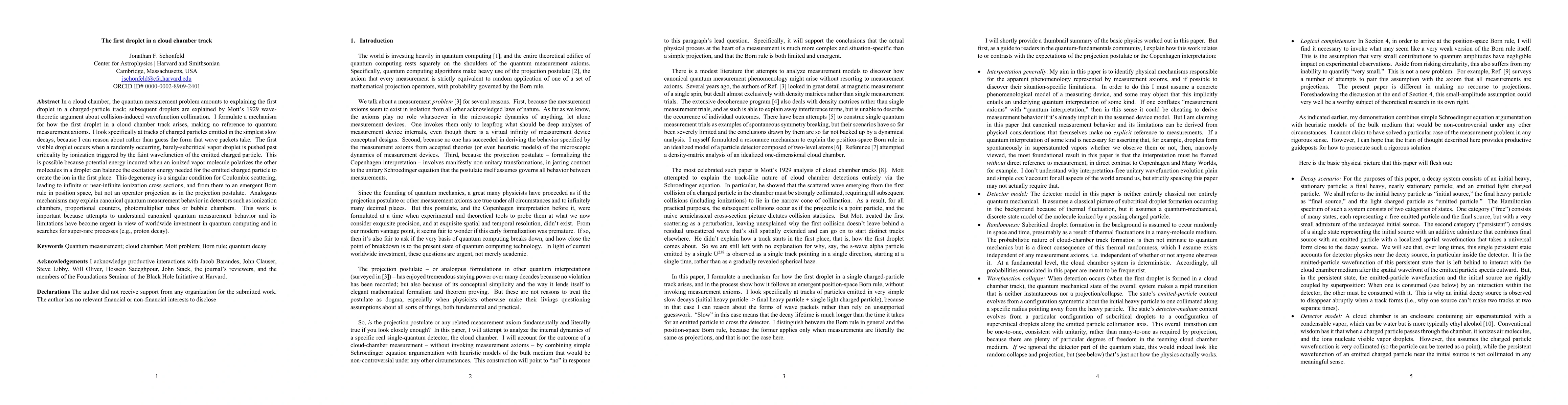 A new mechanism explains how the first droplet in a cloud chamber track arises without referencing quantum measurement axioms, proposing that ionization triggered by charged particle emission pushes a vapor droplet past criticality, leading to its creation.