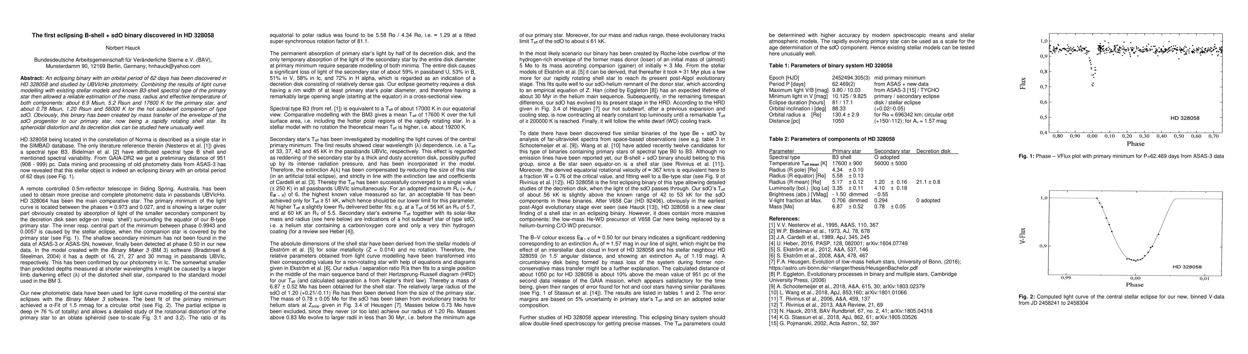 An eclipsing binary with an orbital period of 62 days has been discovered in HD 328058 and studied by UBVIcHalpha photometry. Combining the results of light curve modelling with existing stellar models and known B3-shell spectral type of the primary star then allowed a reliable estimation of the mass, radius and effective temperature of both components: about 6.9 Msun, 5.2 Rsun and 17600 K for the primary star, and about 0.78 Msun, 1.20 Rsun and 56000 K for the hot subdwarf companion of type sdO. Obviously, this binary has been created by mass transfer of the envelope of the sdO progenitor to our primary star, now being a rapidly rotating shell star. Its spheroidal distortion and its decretion disk can be studied here unusually well.
