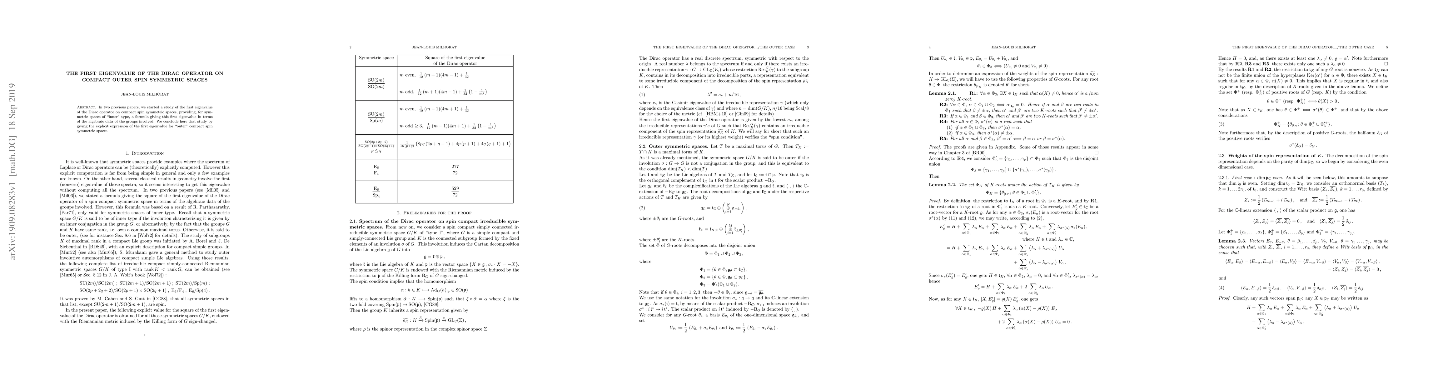 This paper concludes the study of the first eigenvalue of the Dirac operator on compact spin symmetric spaces, providing an explicit expression for "outer" type spaces, building on previous results for "inner" type spaces. The findings are expressed in terms of the algebraic data of the involved groups.