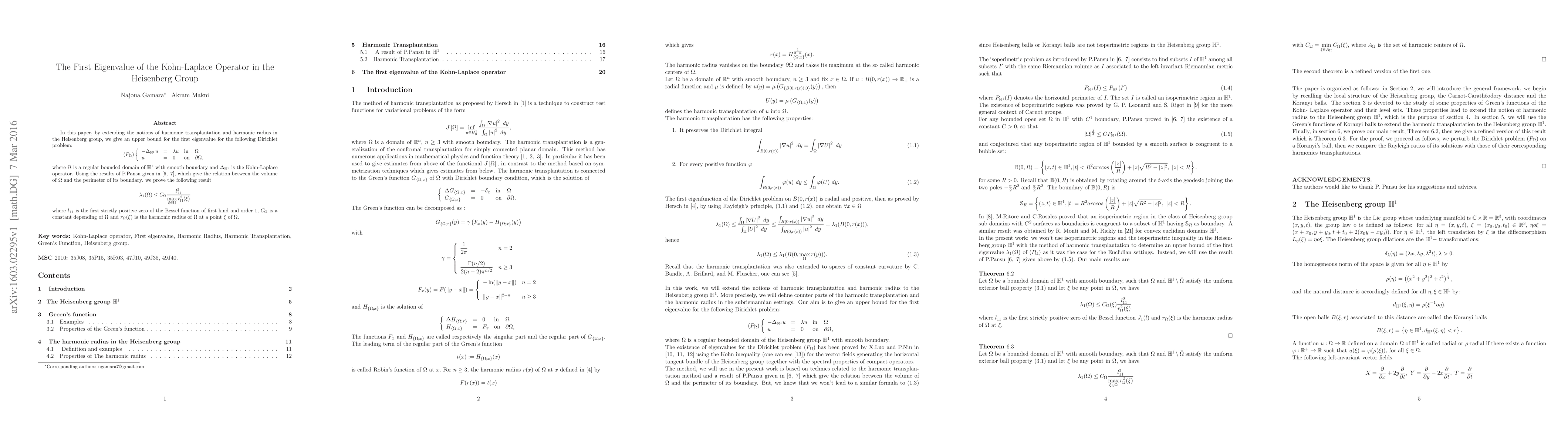 The paper derives an upper bound for the first eigenvalue of the Kohn-Laplace operator in the Heisenberg group, relating it to the domain's volume and harmonic radius.