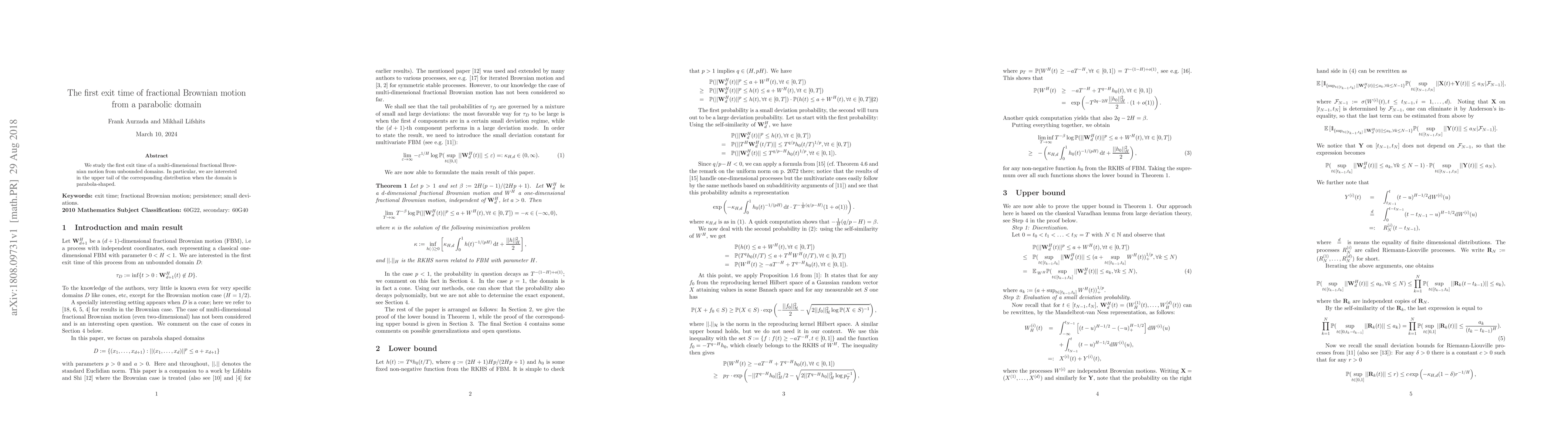 Summary: This paper investigates the first exit time of multi-dimensional fractional Brownian motion from a parabolic domain, focusing on the upper tail behavior of the exit time distribution. The findings provide insights into the probabilistic characteristics of such stochastic processes.