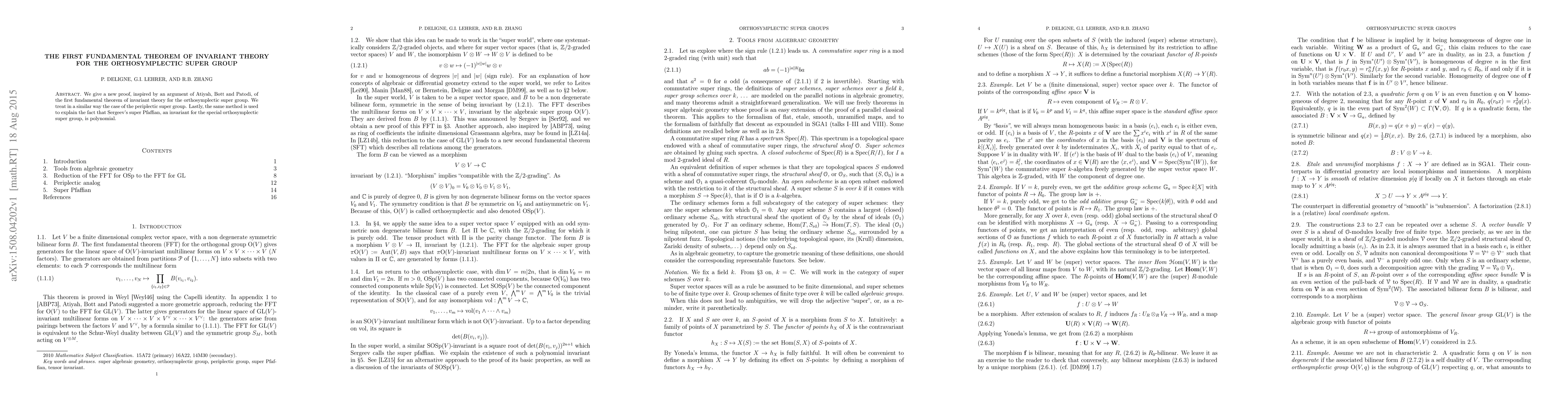 We give a new proof, inspired by an argument of Atiyah, Bott and Patodi, of the first fundamental theorem of invariant theory for the orthosymplectic super group. We treat in a similar way the case of the periplectic super group. Lastly, the same method is used to explain the fact that Sergeev's super Pfaffian, an invariant for the special orthosymplectic super group, is polynomial.