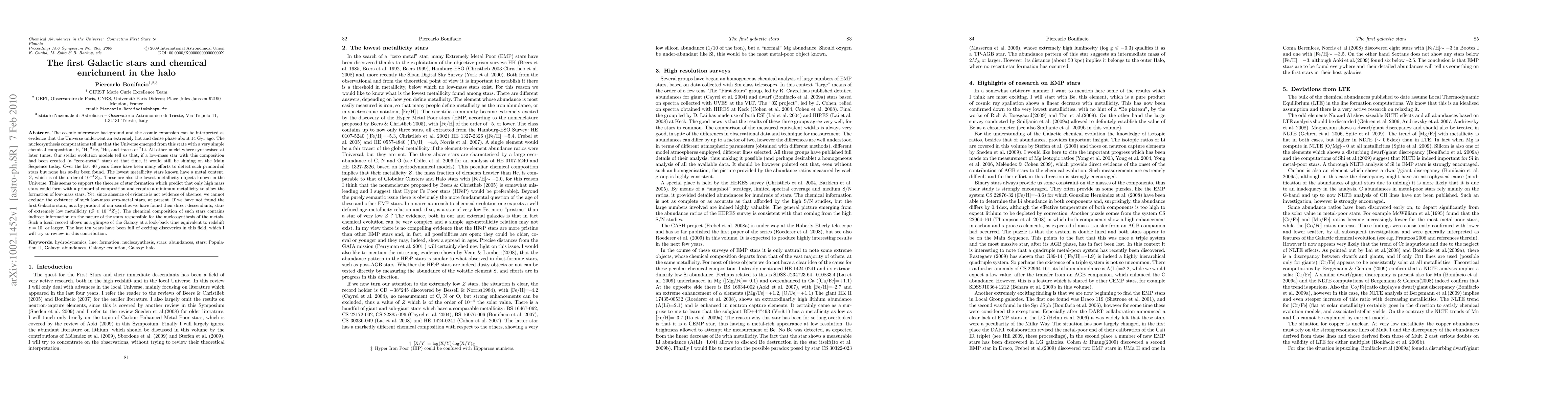 This paper reviews efforts to detect the first Galactic stars, which formed from primordial elements, and discusses the chemical enrichment of the halo through the evolution of extremely low-metallicity stars. It highlights recent discoveries that provide insights into the nucleosynthesis processes and the early universe's star formation history.