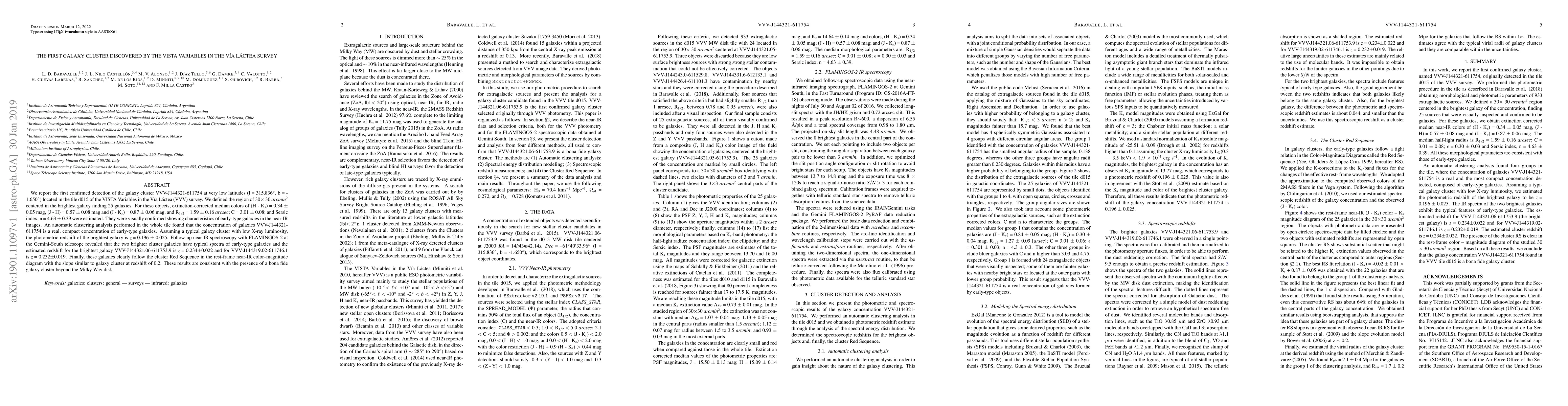 The study utilized the VISTA Variables in the Vía Láctea (VVV) survey data to detect and analyze a galaxy cluster, VVV-J144321-611754, located at very low latitudes. The research involved defining a 30x30 arcmin² region centered on the brightest galaxy, visually confirming 25 galaxies, and estimating their extinction-corrected median colors and morphological parameters.