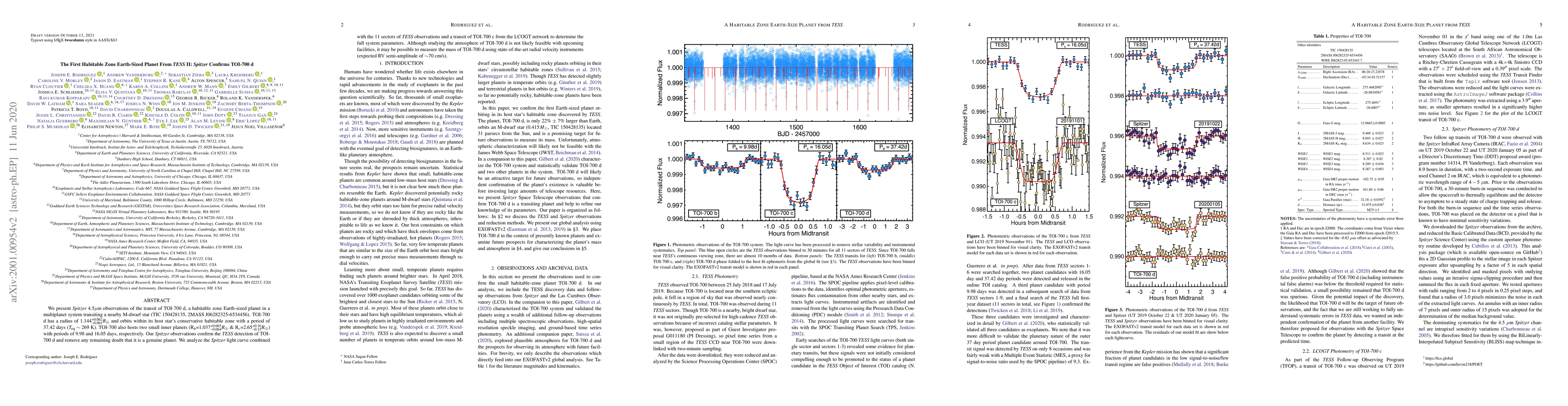 The Spitzer Space Telescope confirmed the existence of TOI-700 d, a habitable zone Earth-sized planet orbiting an M-dwarf star, with a radius of 1.144 R⊕ and a period of 37.42 days. The system also includes two smaller inner planets, suggesting a multiplanet system.