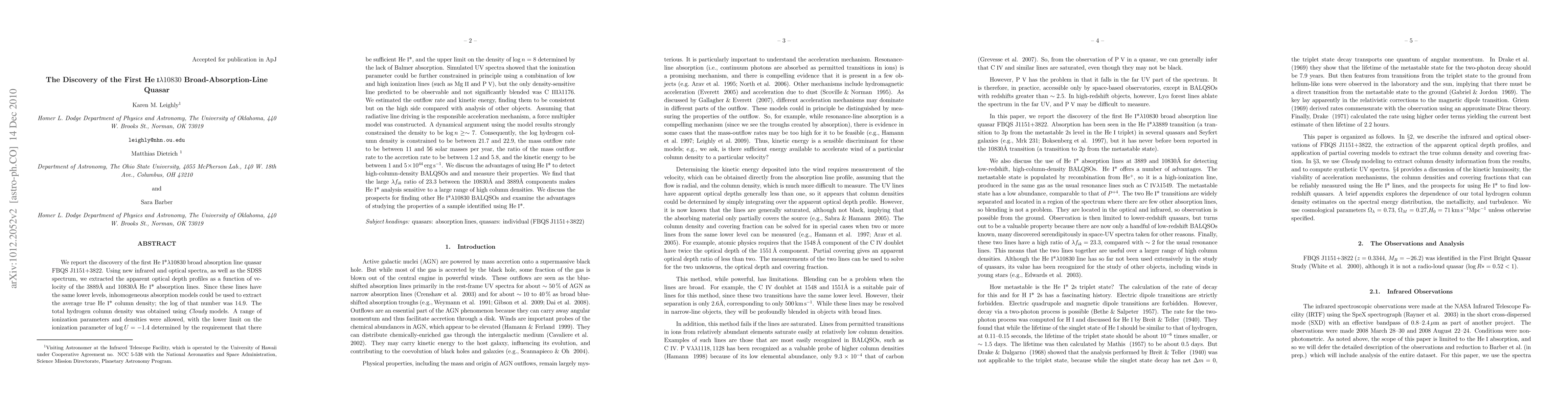 We report the discovery of the first HeI*\lambda 10830 broad absorption line quasar FBQS J1151+3822. Using new infrared and optical spectra, as well as the SDSS spectrum, we extracted the apparent optical depth profiles as a function of velocity of the 3889A and 10830A HeI* absorption lines. Since these lines have the same lower levels, inhomogeneous absorption models could be used to extract the average true HeI* column density; the log of that number was 14.9. The total hydrogen column density was obtained using Cloudy models. A range of ionization parameters and densities were allowed, with the lower limit on the ionization parameter of log U=-1.4 determined by the requirement that there be sufficient HeI*, and the upper limit on the density of log n=8 determined by the lack of Balmer absorption. Simulated UV spectra showed that the ionization parameter could be further constrained in principle using a combination of low and high ionization lines (such as MgII and PV), but the only density-sensitive line predicted to be observable and not significantly blended was CIII\lambda 1176. We estimated the outflow rate and kinetic energy, finding them to be consistent but on the high side compared with analysis of other objects. Assuming that radiative line driving is the responsible acceleration mechanism, a force multipler model was constructed. A dynamical argument using the model results strongly constrained the density to be log n >= ~7. Consequently, the log hydrogen column density is constrained to be between 21.7 and 22.9, the mass outflow rate to be between 11 and 56 solar masses per year, the ratio of the mass outflow rate to the accretion rate to be between 1.2 and 5.8, and the kinetic energy to be between 1 and 5 x 10^44 erg/s. We discuss the advantages of using HeI* to detect high-column-density BALQSOs and and measure their properties. (Abridged)