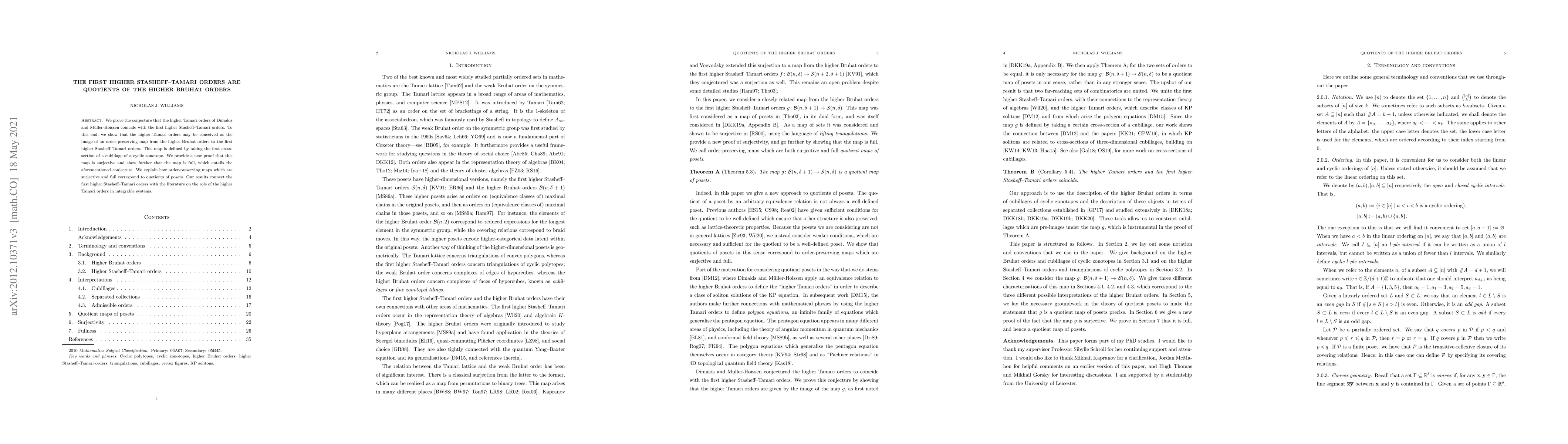 We prove the conjecture that the higher Tamari orders of Dimakis and M\"uller-Hoissen coincide with the first higher Stasheff--Tamari orders. To this end, we show that the higher Tamari orders may be conceived as the image of an order-preserving map from the higher Bruhat orders to the first higher Stasheff--Tamari orders. This map is defined by taking the first cross-section of a cubillage of a cyclic zonotope. We provide a new proof that this map is surjective and show further that the map is full, which entails the aforementioned conjecture. We explain how order-preserving maps which are surjective and full correspond to quotients of posets. Our results connect the first higher Stasheff--Tamari orders with the literature on the role of the higher Tamari orders in integrable systems.