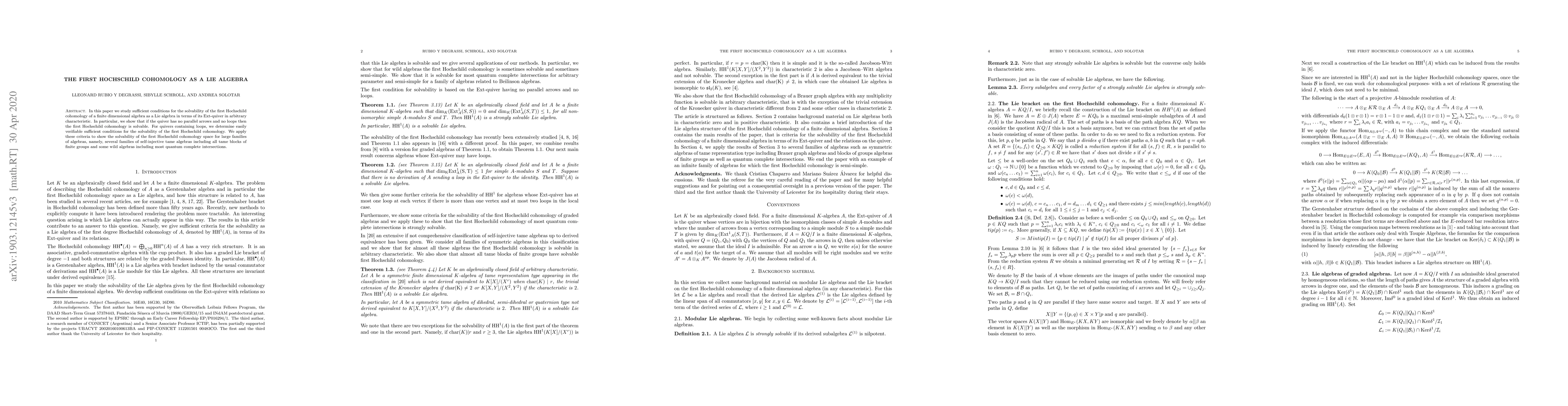 This paper explores conditions for the solvability of the first Hochschild cohomology of finite dimensional algebras as a Lie algebra, showing that solvability occurs when the Ext-quiver has no parallel arrows or loops. It also provides conditions for quivers with loops and applies these findings to solvable cases in various families of algebras.