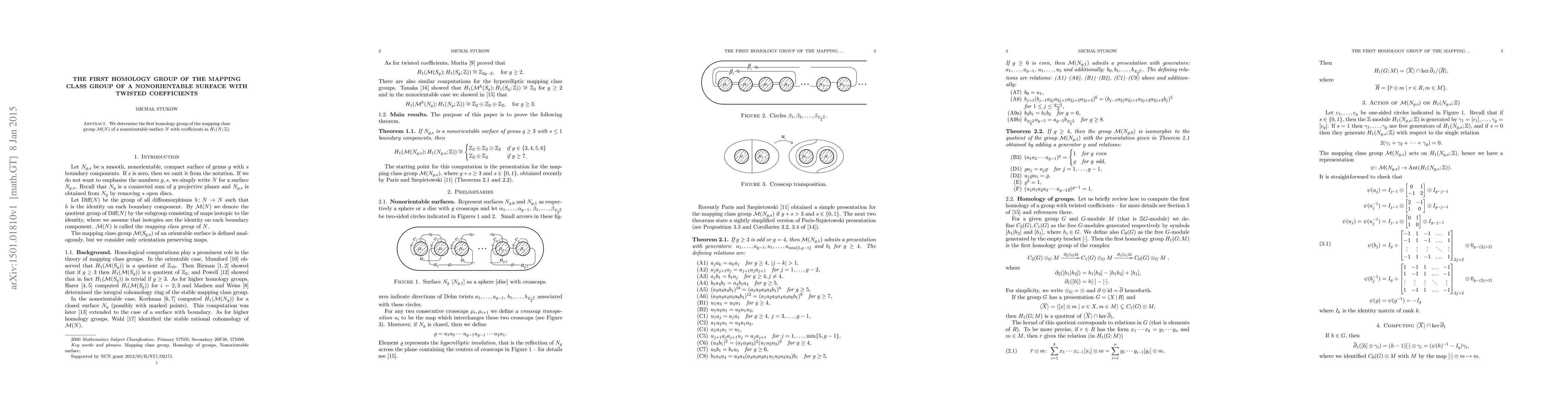 Summary: This paper identifies the first homology group of the mapping class group M(N) for a nonorientable surface N using twisted coefficients derived from H_1(N;Z). The result reveals intricate algebraic properties of the mapping class group under this specific coefficient system.