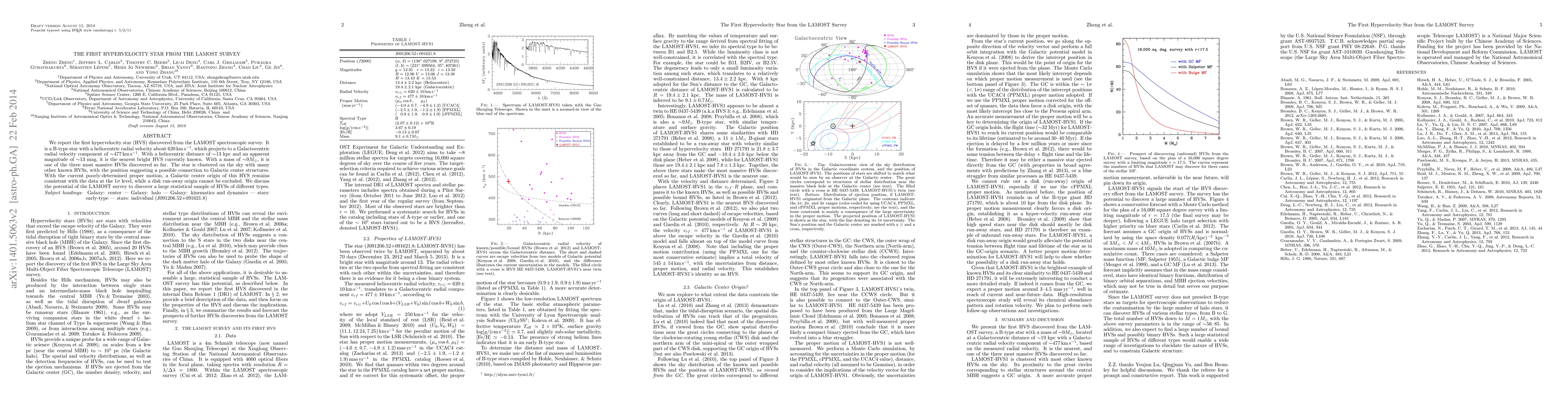 The LAMOST survey has identified the first hypervelocity star (HVS), a B-type star with a high radial velocity of ~477 km/s, making it one of the nearest and most massive HVSs known. Its origin from the Galactic center remains plausible.
