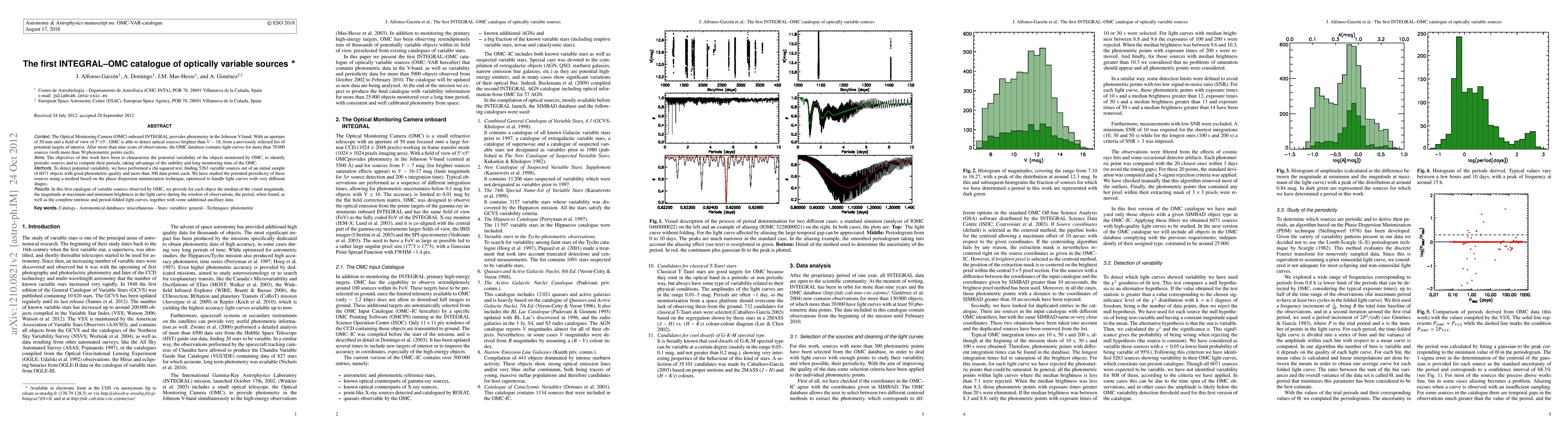 The Optical Monitoring Camera (OMC) onboard INTEGRAL provides photometry in the Johnson V-band. With an aperture of 50 mm and a field of view of 5deg x 5deg, OMC is able to detect optical sources brighter than V~18, from a previously selected list of potential targets of interest. After more than nine years of observations, the OMC database contains light curves for more than 70000 sources (with more than 50 photometric points each). The objectives of this work have been to characterize the potential variability of the objects monitored by OMC, to identify periodic sources and to compute their periods, taking advantage of the stability and long monitoring time of the OMC. To detect potential variability, we have performed a chi-squared test, finding 5263 variable sources out of an initial sample of 6071 objects with good photometric quality and more than 300 data points each. We have studied the periodicity of these sources using a method based on the phase dispersion minimization technique, optimized to handle light curves with very different shapes.In this first catalogue of variable sources observed by OMC, we provide for each object the median of the visual magnitude, the magnitude at maximum and minimum brightness in the light curve during the window of observations, the period, when found, as well as the complete intrinsic and period-folded light curves, together with some additional ancillary data.