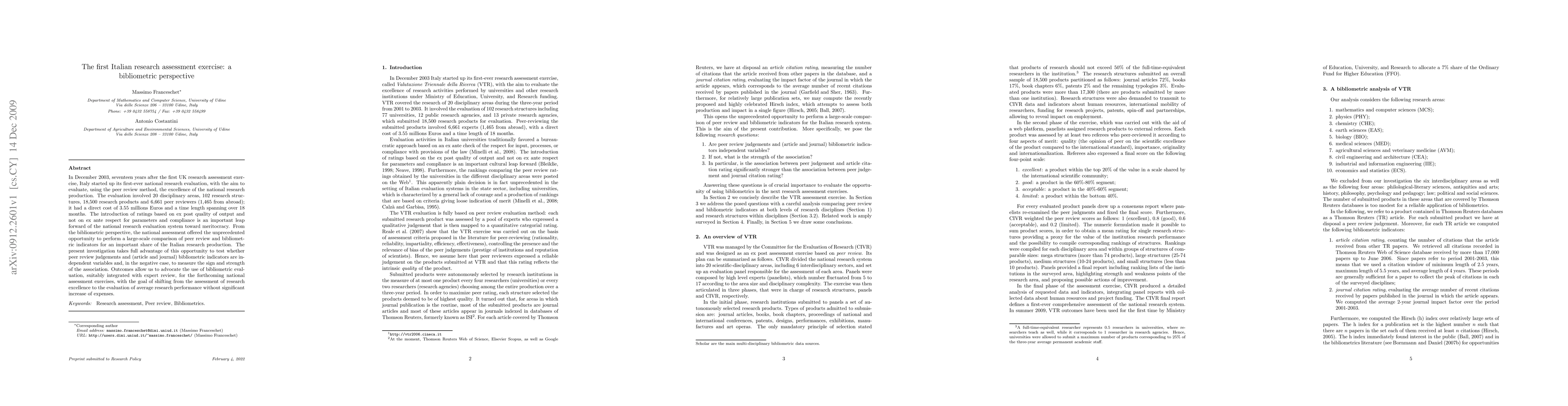 This paper examines Italy's first national research assessment exercise, comparing peer review and bibliometric indicators over 20 disciplinary areas. It finds that while bibliometric indicators and peer review judgments are not independent, bibliometric evaluation can be effectively integrated with expert review to improve assessment efficiency.