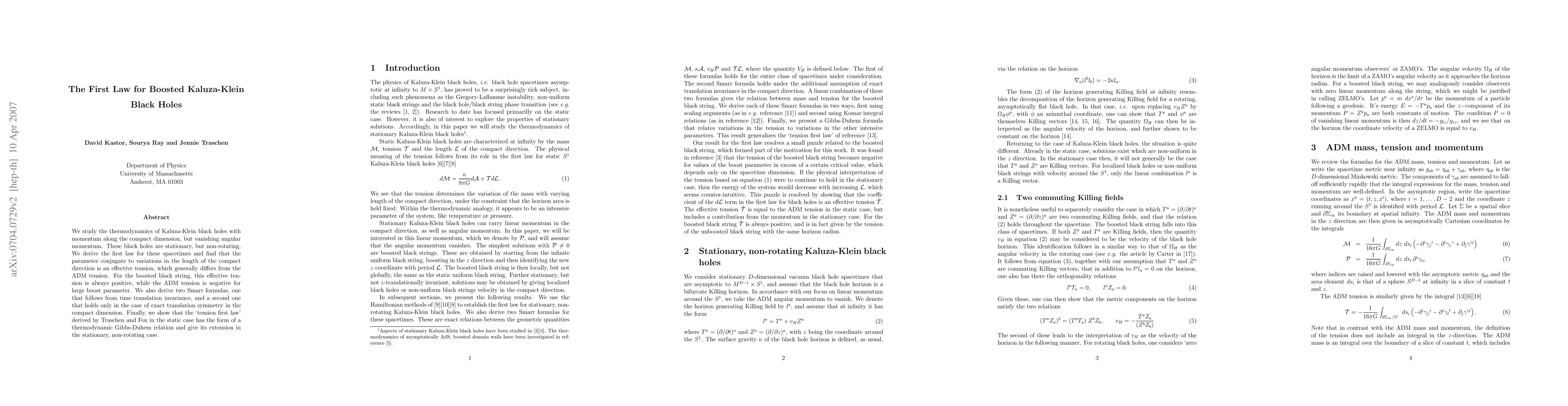 We study the thermodynamics of Kaluza-Klein black holes with momentum along the compact dimension, but vanishing angular momentum. These black holes are stationary, but non-rotating. We derive the first law for these spacetimes and find that the parameter conjugate to variations in the length of the compact direction is an effective tension, which generally differs from the ADM tension. For the boosted black string, this effective tension is always positive, while the ADM tension is negative for large boost parameter. We also derive two Smarr formulas, one that follows from time translation invariance, and a second one that holds only in the case of exact translation symmetry in the compact dimension. Finally, we show that the `tension first law' derived by Traschen and Fox in the static case has the form of a thermodynamic Gibbs-Duhem relation and give its extension in the stationary, non-rotating case.