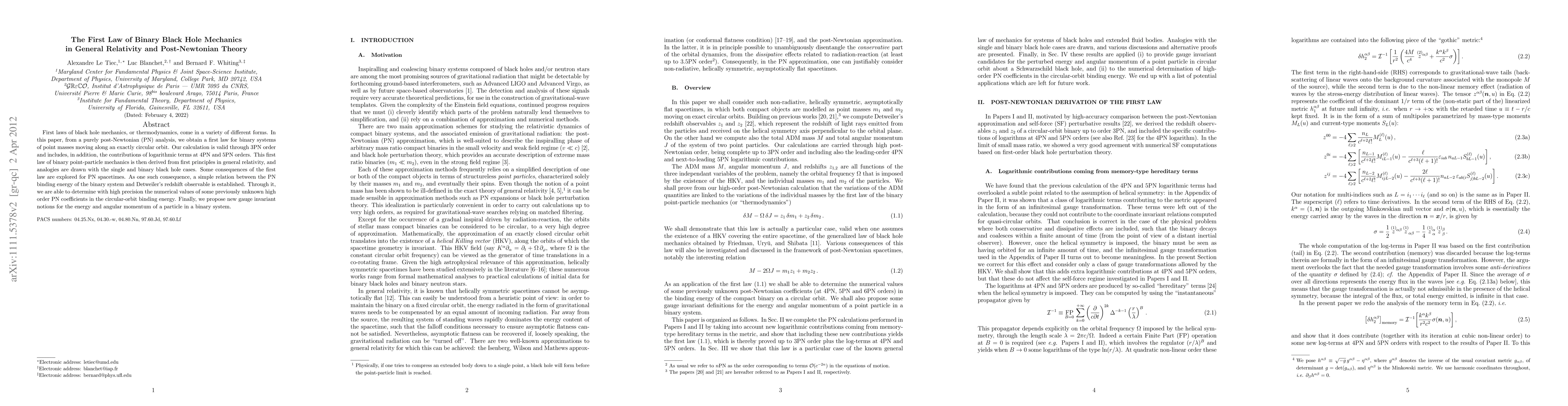 First laws of black hole mechanics, or thermodynamics, come in a variety of different forms. In this paper, from a purely post-Newtonian (PN) analysis, we obtain a first law for binary systems of point masses moving along an exactly circular orbit. Our calculation is valid through 3PN order and includes, in addition, the contributions of logarithmic terms at 4PN and 5PN orders. This first law of binary point-particle mechanics is then derived from first principles in general relativity, and analogies are drawn with the single and binary black hole cases. Some consequences of the first law are explored for PN spacetimes. As one such consequence, a simple relation between the PN binding energy of the binary system and Detweiler's redshift observable is established. Through it, we are able to determine with high precision the numerical values of some previously unknown high order PN coefficients in the circular-orbit binding energy. Finally, we propose new gauge invariant notions for the energy and angular momentum of a particle in a binary system.