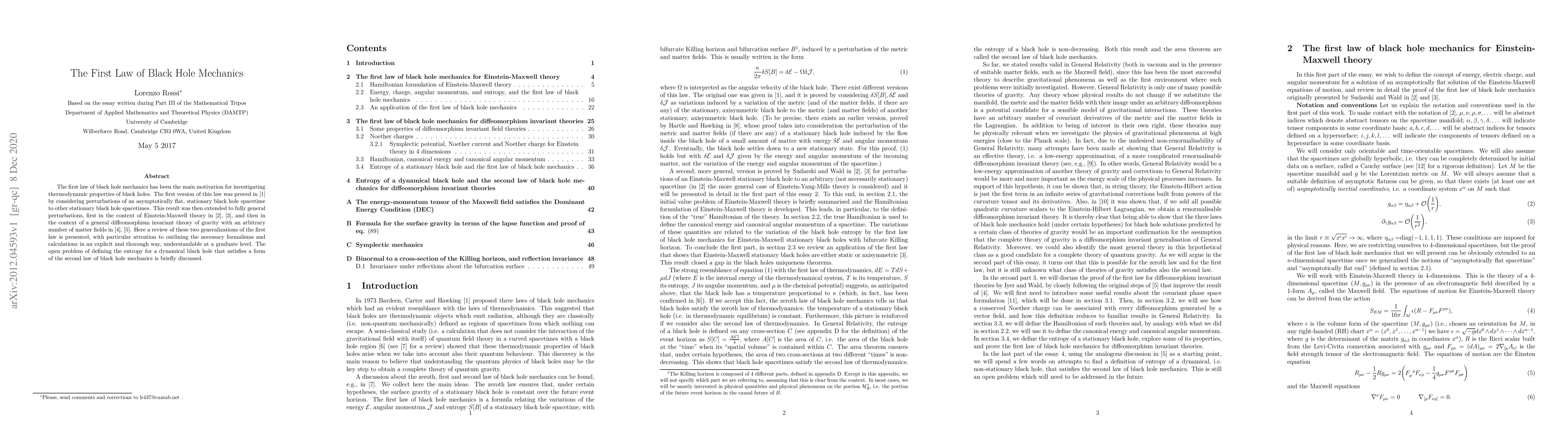 The first law of black hole mechanics has been the main motivation for investigating thermodynamic properties of black holes. The first version of this law was proved in \cite{Bardeen:1973gs} by considering perturbations of an asymptotically flat, stationary black hole spacetime to other stationary black hole spacetimes. This result was then extended to fully general perturbations, first in the context of Einstein-Maxwell theory in \cite{Sudarsky:1992ty},\cite{Wald:1993ki}, and then in the context of a general diffeomorphism invariant theory of gravity with an arbitrary number of matter fields in \cite{Wald:1993nt},\cite{Iyer:1994ys}. Here a review of these two generalizations of the first law is presented, with particular attention to outlining the necessary formalisms and calculations in an explicit and thorough way, understandable at a graduate level. The open problem of defining the entropy for a dynamical black hole that satisfies a form of the second law of black hole mechanics is briefly discussed.
