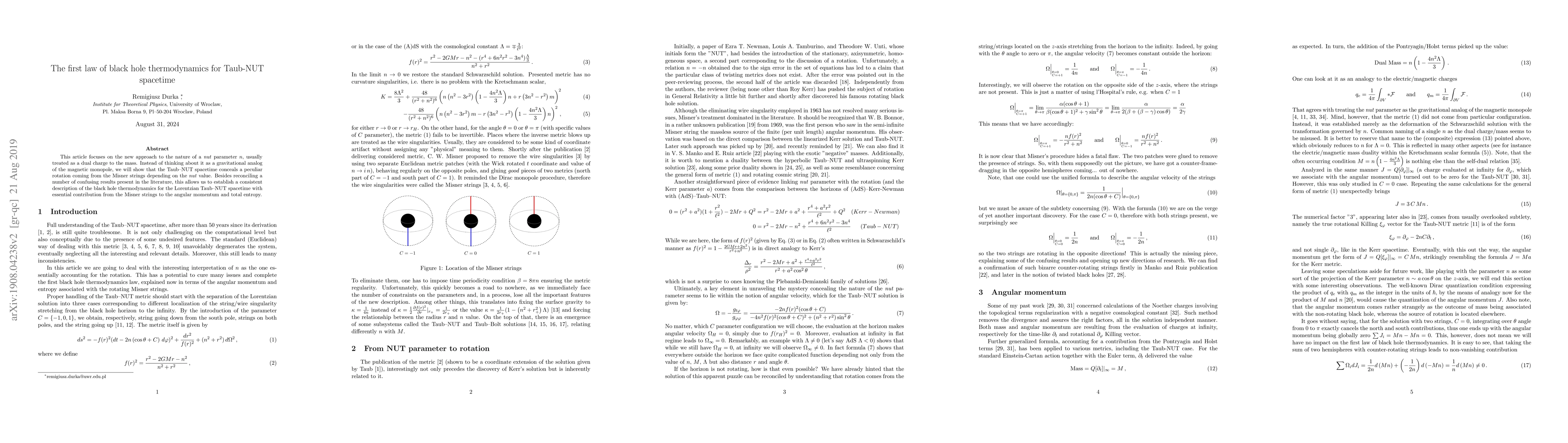 This article focuses on the new approach to the nature of a nut parameter $n$, usually treated as a dual charge to the mass. Instead of thinking about it as a gravitational analog of the magnetic monopole, we will show that the Taub-NUT spacetime conceals a peculiar rotation coming from the Misner strings depending on the nut value. Besides reconciling a number of confusing results present in the literature, this allows us to establish a consistent description of the black hole thermodynamics for the Lorentzian Taub--NUT spacetime with essential contribution from the Misner strings to the angular momentum and total entropy.