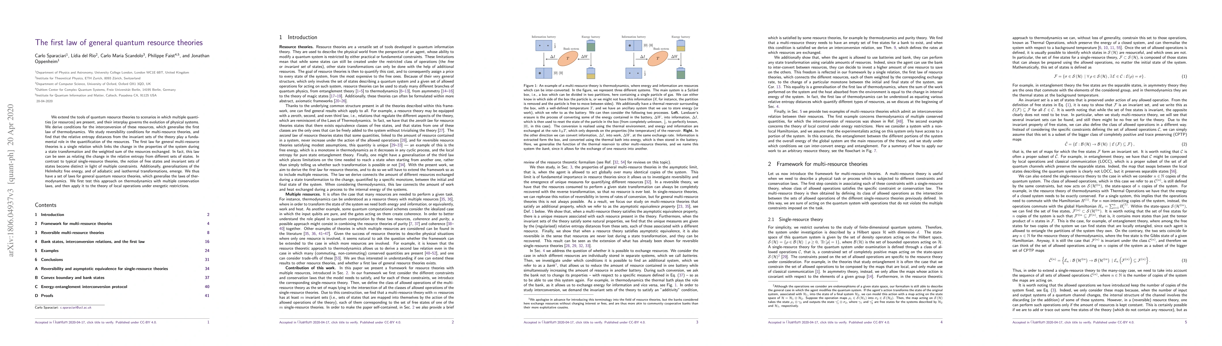 We extend the tools of quantum resource theories to scenarios in which multiple quantities (or resources) are present, and their interplay governs the evolution of physical systems. We derive conditions for the interconversion of these resources, which generalise the first law of thermodynamics. We study reversibility conditions for multi-resource theories, and find that the relative entropy distances from the invariant sets of the theory play a fundamental role in the quantification of the resources. The first law for general multi-resource theories is a single relation which links the change in the properties of the system during a state transformation and the weighted sum of the resources exchanged. In fact, this law can be seen as relating the change in the relative entropy from different sets of states. In contrast to typical single-resource theories, the notion of free states and invariant sets of states become distinct in light of multiple constraints. Additionally, generalisations of the Helmholtz free energy, and of adiabatic and isothermal transformations, emerge. We thus have a set of laws for general quantum resource theories, which generalise the laws of thermodynamics. We first test this approach on thermodynamics with multiple conservation laws, and then apply it to the theory of local operations under energetic restrictions.