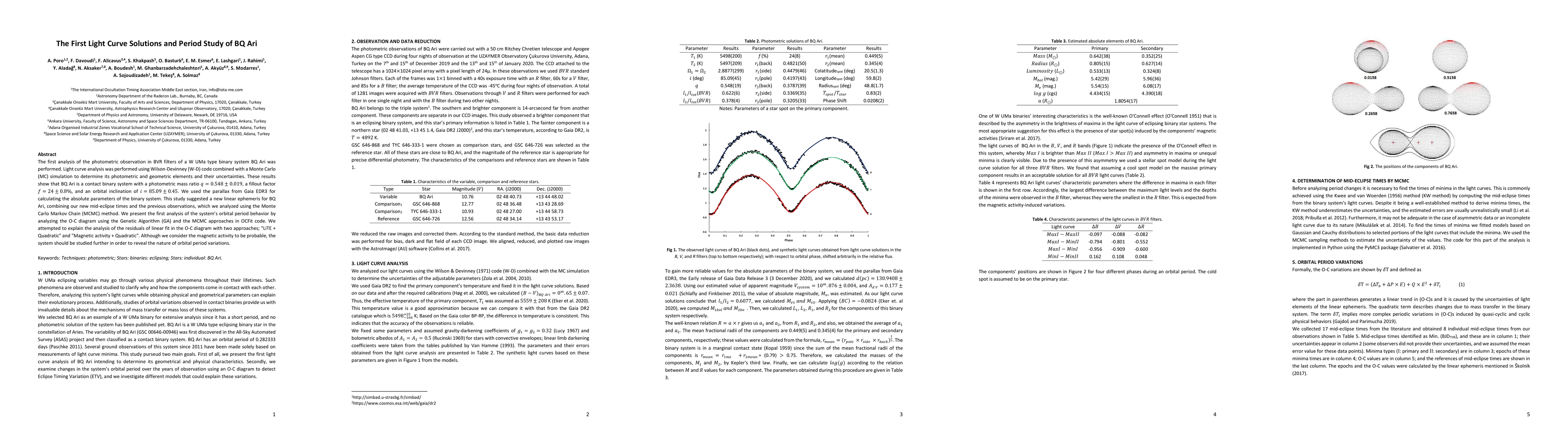 The first analysis of the photometric observation in BVR filters of a W UMa type binary system BQ Ari was performed. Light curve analysis was performed using Wilson-Devinney (W-D) code combined with a Monte Carlo (MC) simulation to determine its photometric and geometric elements and their uncertainties. These results show that BQ Ari is a contact binary system with a photometric mass ratio q=0.548\pm0.019, a fillout factor f=24\pm0.8 percent, and an orbital inclination of i=85.09\pm0.45. We used the parallax from Gaia EDR3 for calculating the absolute parameters of the binary system. This study suggested a new linear ephemeris for BQ Ari, combining our new mid-eclipse times and the previous observations, which we analyzed using the Monte Carlo Markov Chain (MCMC) method. We present the first analysis of the system's orbital period behavior by analyzing the O-C diagram using the Genetic Algorithm (GA) and the MCMC approaches in OCFit code. We attempted to explain the analysis of the residuals of linear fit in the O-C diagram with two approaches; "LiTE + Quadratic" and "Magnetic activity + Quadratic". Although we consider the magnetic activity to be probable, the system should be studied further in order to reveal the nature of orbital period variations.