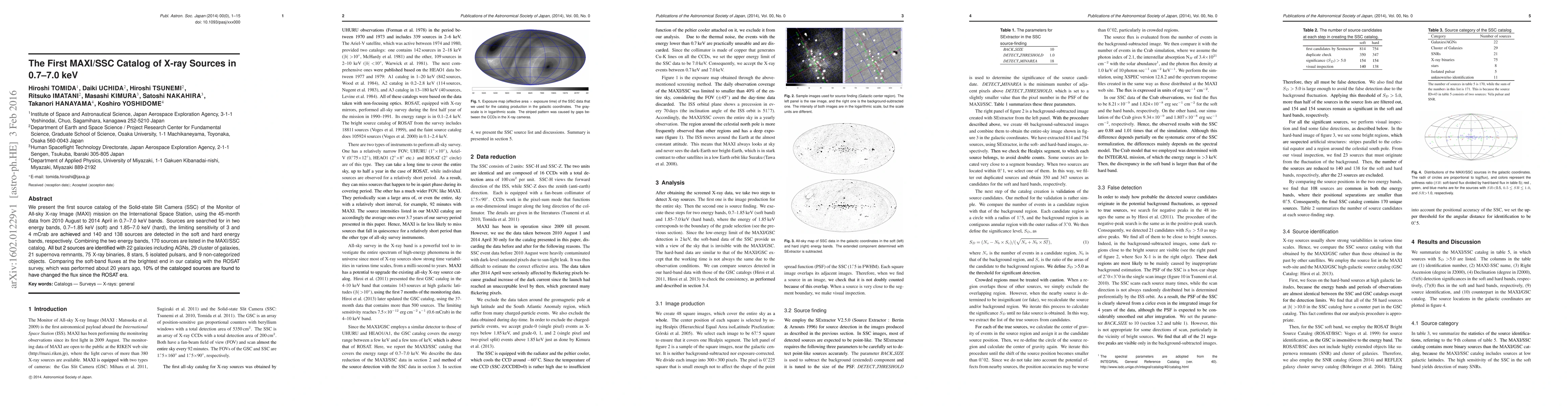 The MAXI/SSC catalog presents the first source catalog from the MAXI mission's Solid-state Slit Camera, identifying 170 X-ray sources in 0.7-7.0 keV bands, with 140 and 138 detected in soft and hard bands respectively. Most sources are identified with various astronomical objects, and 10% show flux changes since the ROSAT survey.