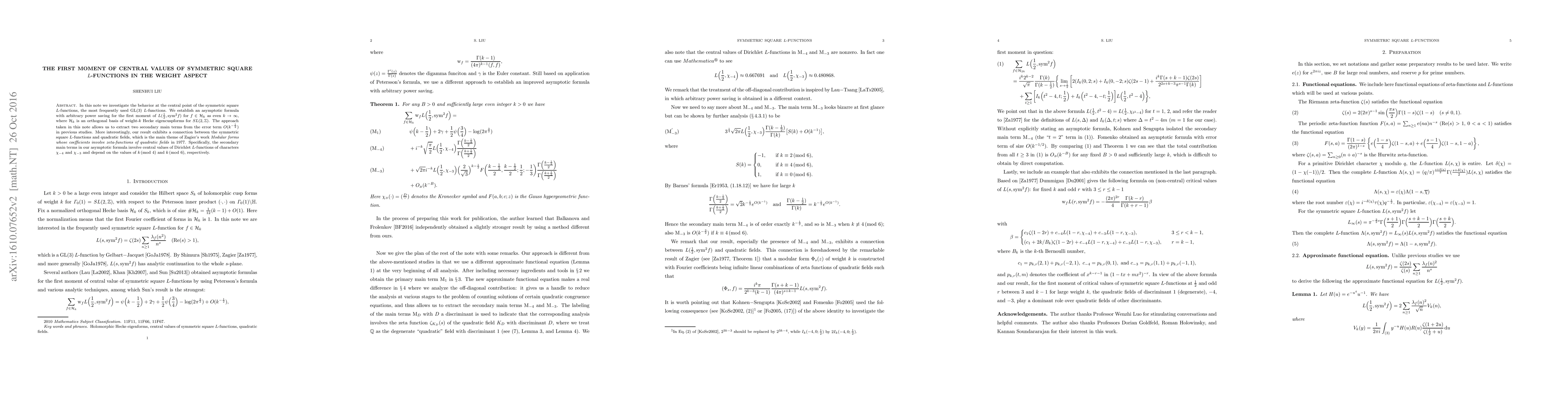 In this note we investigate the behavior at the central point of the symmetric square $L$-functions, the most frequently used $\rm{GL}(3)$ $L$-functions. We establish an asymptotic formula with arbitrary power saving for the first moment of $L(\frac{1}{2},{\rm{sym}}^2f)$ for $f\in\mathcal{H}_k$ as even $k\rightarrow\infty$, where $\mathcal{H}_k$ is an orthogonal basis of weight-$k$ Hecke eigencuspforms for $SL(2,\mathbb{Z})$. The approach taken in this note allows us to extract two secondary main terms from the error term $O(k^{-\frac{1}{2}})$ in previous studies. More interestingly, our result exhibits a connection between the symmetric square $L$-functions and quadratic fields, which is the main theme of Zagier's work "Modular forms whose coefficients involve zeta-functions of quadratic fields" in 1977. Specifically, the secondary main terms in our asymptotic formula involve central values of Dirichlet $L$-functions of characters $\chi_{-4}$ and $\chi_{-3}$ and depend on the values of $k\,({\rm{mod}}\ 4)$ and $k\,({\rm{mod}}\ 6)$, respectively.