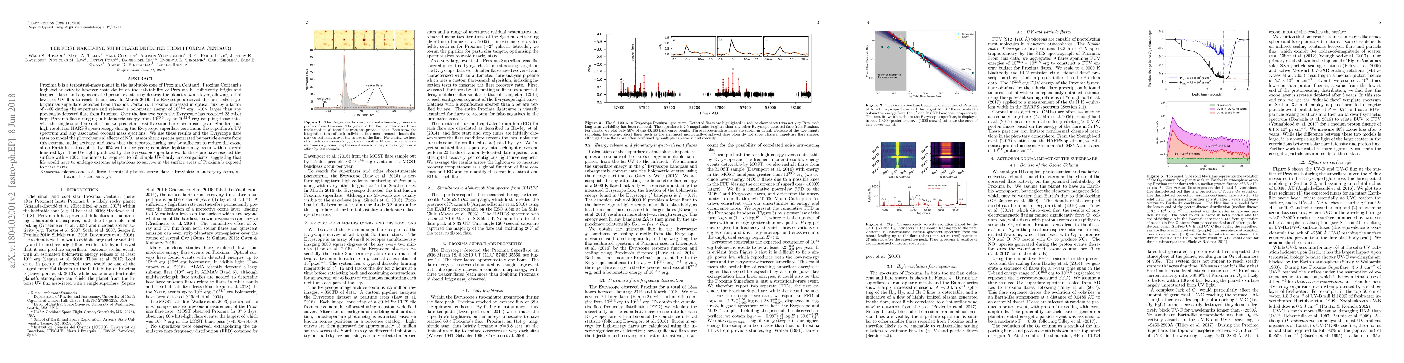 The first naked-eye superflare from Proxima Centauri was detected in March 2016, increasing its optical flux by a factor of ~68 and releasing 10^33.5 erg of energy. This flare, along with others observed, suggests frequent superflares could severely deplete the ozone layer of Proxima b, exposing it to lethal UV radiation.